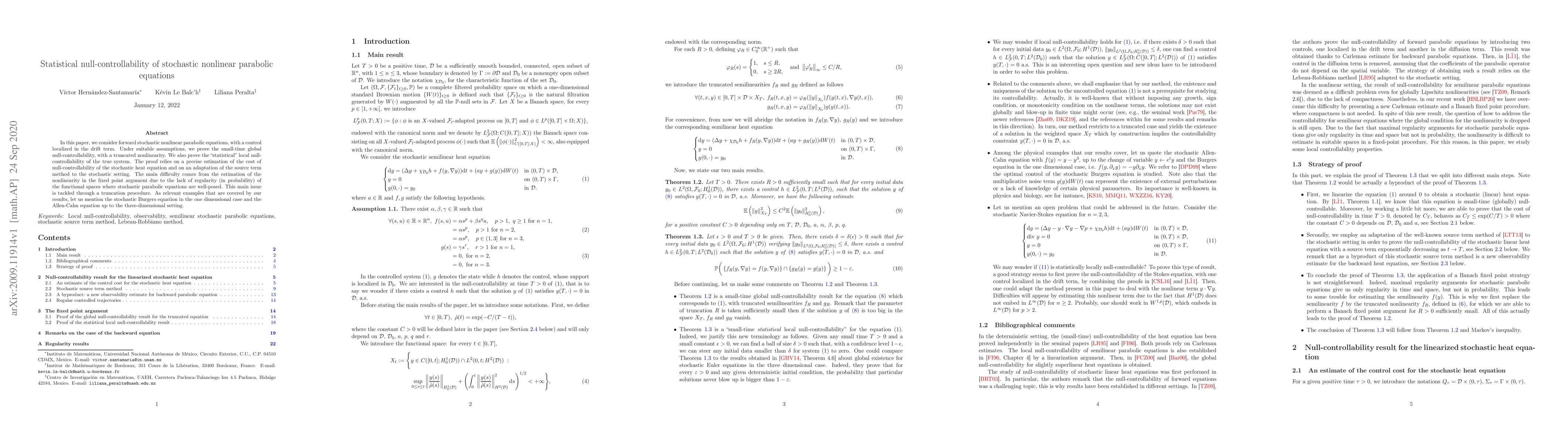 In this paper, we consider forward stochastic nonlinear parabolic equations, with a control localized in the drift term. Under suitable assumptions, we prove the small-time global null-controllability, with a truncated nonlinearity. We also prove the statistical local null-controllability of the true system. The proof relies on a precise estimation of the cost of null-controllability of the stochastic heat equation and on an adaptation of the source term method to the stochastic setting. The main difficulty comes from the estimation of the nonlinearity in the fixed point argument due to the lack of regularity (in probability) of the functional spaces where stochastic parabolic equations are well-posed. This main issue is tackled through a truncation procedure. As relevant examples that are covered by our results, let us mention the stochastic Burgers equation in the one dimensional case and the Allen-Cahn equation up to the three-dimensional setting.