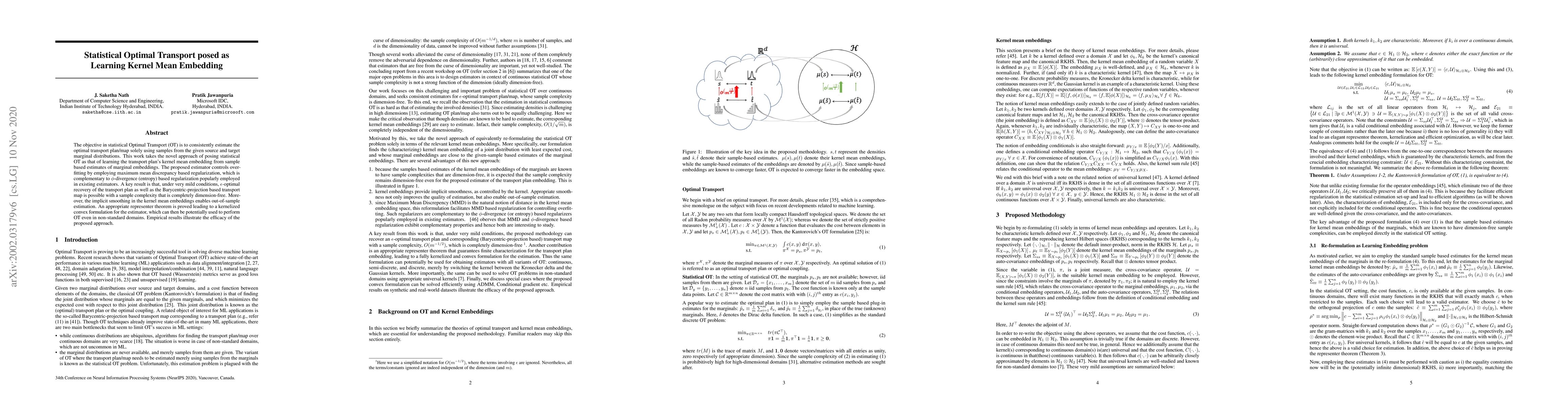 This paper proposes a novel method for statistical Optimal Transport by learning kernel mean embeddings of transport plans from sample-based marginal embeddings, employing regularization to control overfitting. The approach achieves dimension-free sample complexity and enables out-of-sample estimation, with empirical results demonstrating its effectiveness.