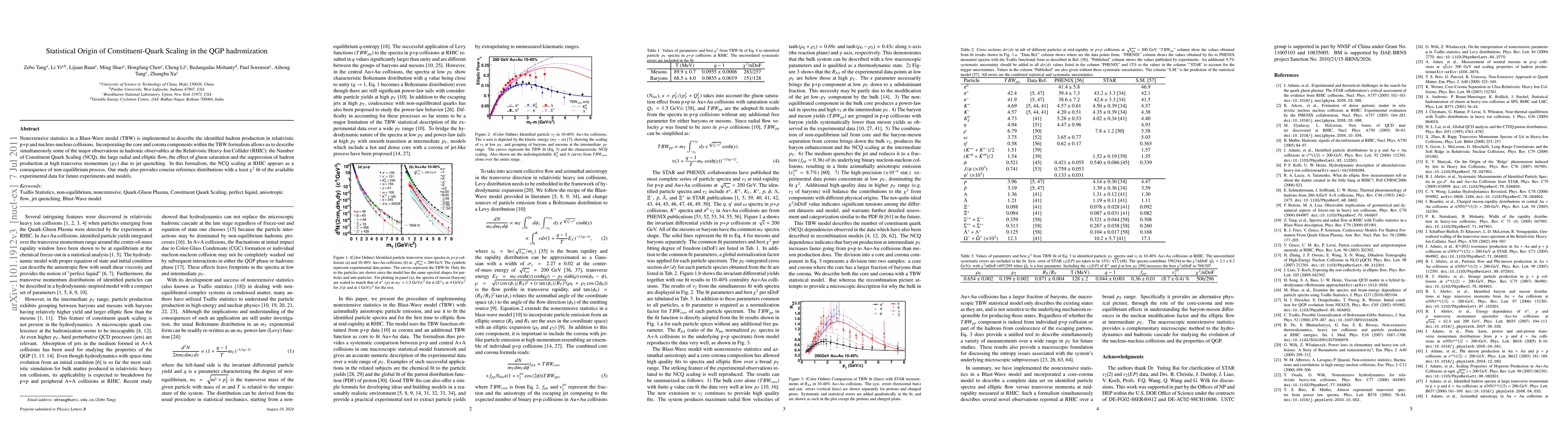 This paper uses a Blast-Wave model incorporating nonextensive statistics to describe identified hadron production in relativistic collisions, explaining the Number of Constituent Quark Scaling (NCQ) as a non-equilibrium process. It provides reference distributions for future experiments and models.