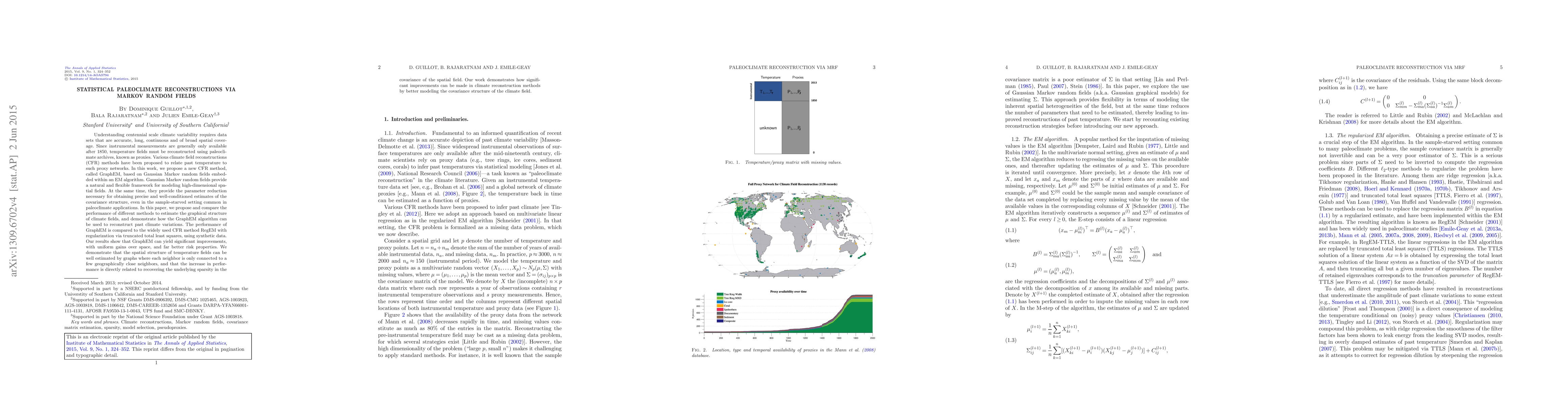 This paper introduces GraphEM, a new climate field reconstruction method based on Gaussian Markov random fields within an EM algorithm, which significantly improves upon existing methods like RegEM by better modeling the spatial covariance structure of temperature fields, leading to more accurate and precise paleoclimate reconstructions.