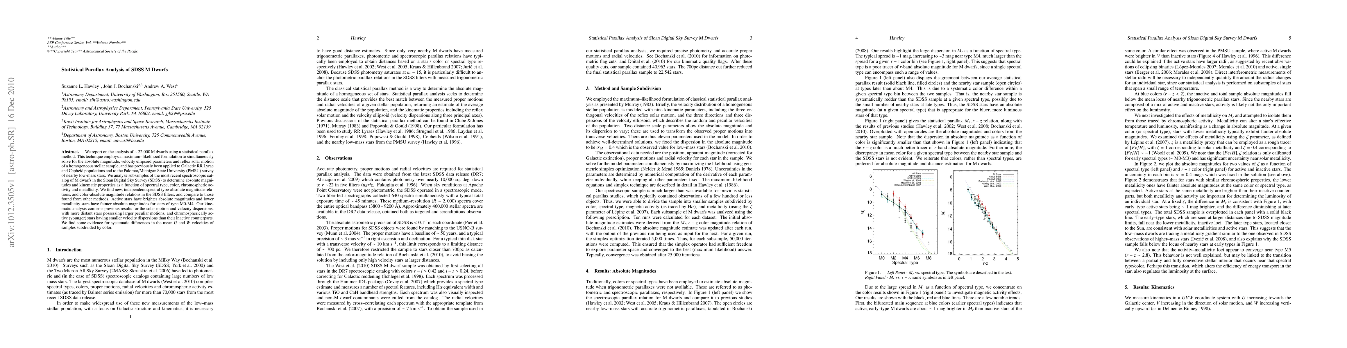 Researchers analyzed 22,000 M dwarf stars using a statistical parallax method to find new relations between spectral type, color, chromospheric activity, and metallicity, as well as kinematic properties like velocity dispersions and solar motion.