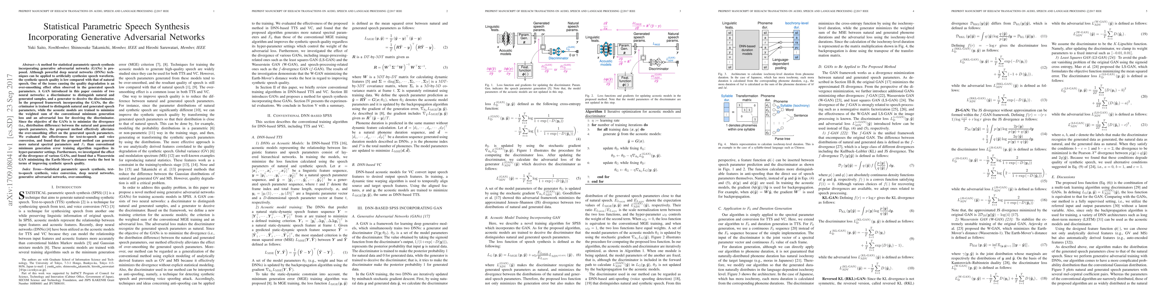 A method for statistical parametric speech synthesis incorporating generative adversarial networks (GANs) is proposed. Although powerful deep neural networks (DNNs) techniques can be applied to artificially synthesize speech waveform, the synthetic speech quality is low compared with that of natural speech. One of the issues causing the quality degradation is an over-smoothing effect often observed in the generated speech parameters. A GAN introduced in this paper consists of two neural networks: a discriminator to distinguish natural and generated samples, and a generator to deceive the discriminator. In the proposed framework incorporating the GANs, the discriminator is trained to distinguish natural and generated speech parameters, while the acoustic models are trained to minimize the weighted sum of the conventional minimum generation loss and an adversarial loss for deceiving the discriminator. Since the objective of the GANs is to minimize the divergence (i.e., distribution difference) between the natural and generated speech parameters, the proposed method effectively alleviates the over-smoothing effect on the generated speech parameters. We evaluated the effectiveness for text-to-speech and voice conversion, and found that the proposed method can generate more natural spectral parameters and $F_0$ than conventional minimum generation error training algorithm regardless its hyper-parameter settings. Furthermore, we investigated the effect of the divergence of various GANs, and found that a Wasserstein GAN minimizing the Earth-Mover's distance works the best in terms of improving synthetic speech quality.