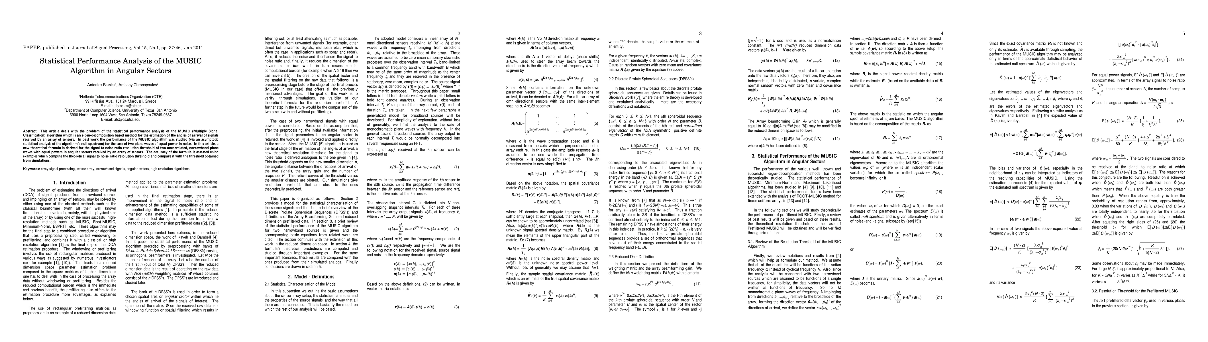 The MUSIC algorithm's performance is analyzed for estimating angles of arrival in angular sectors, with a new formula derived for the signal-to-noise ratio resolution threshold of two uncorrelated plane waves.