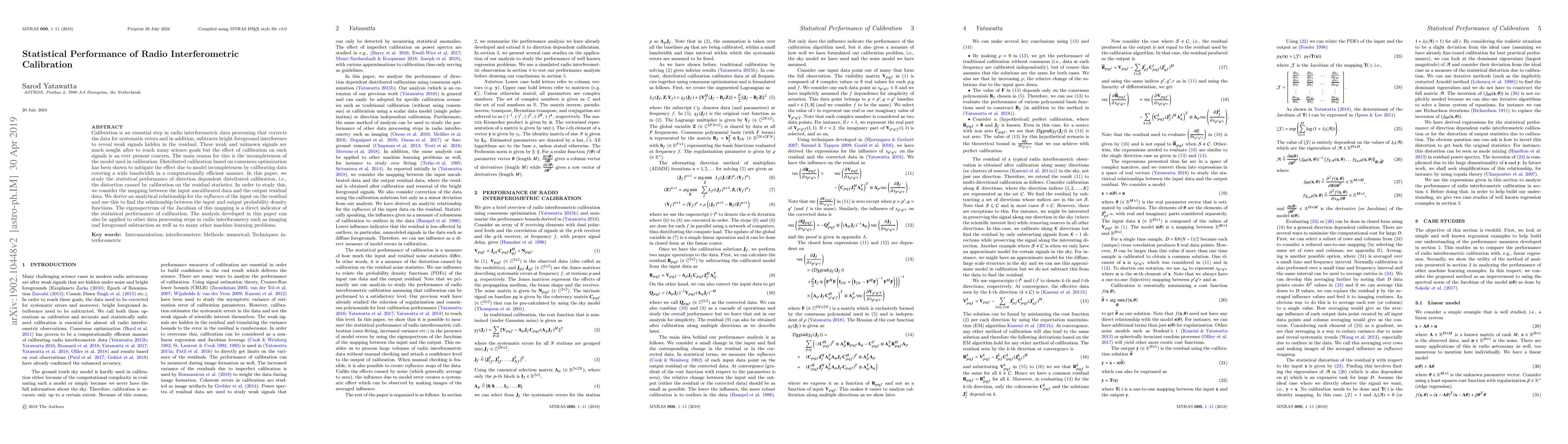 Calibration is an essential step in radio interferometric data processing that corrects the data for systematic errors and in addition, subtracts bright foreground interference to reveal weak signals hidden in the residual. These weak and unknown signals are much sought after to reach many science goals but the effect of calibration on such signals is an ever present concern. The main reason for this is the incompleteness of the model used in calibration. Distributed calibration based on consensus optimization has been shown to mitigate the effect due to model incompleteness by calibrating data covering a wide bandwidth in a computationally efficient manner. In this paper, we study the statistical performance of direction dependent distributed calibration, i.e., the distortion caused by calibration on the residual statistics. In order to study this, we consider the mapping between the input uncalibrated data and the output residual data. We derive an analytical relationship for the influence of the input on the residual and use this to find the relationship between the input and output probability density functions. Using simulations we show that the smallest eigenvalue of the Jacobian of this mapping is a reliable indicator of the statistical performance of calibration. The analysis developed in this paper can also be applied to other data processing steps in radio interferometry such as imaging and foreground subtraction as well as to many other machine learning problems.