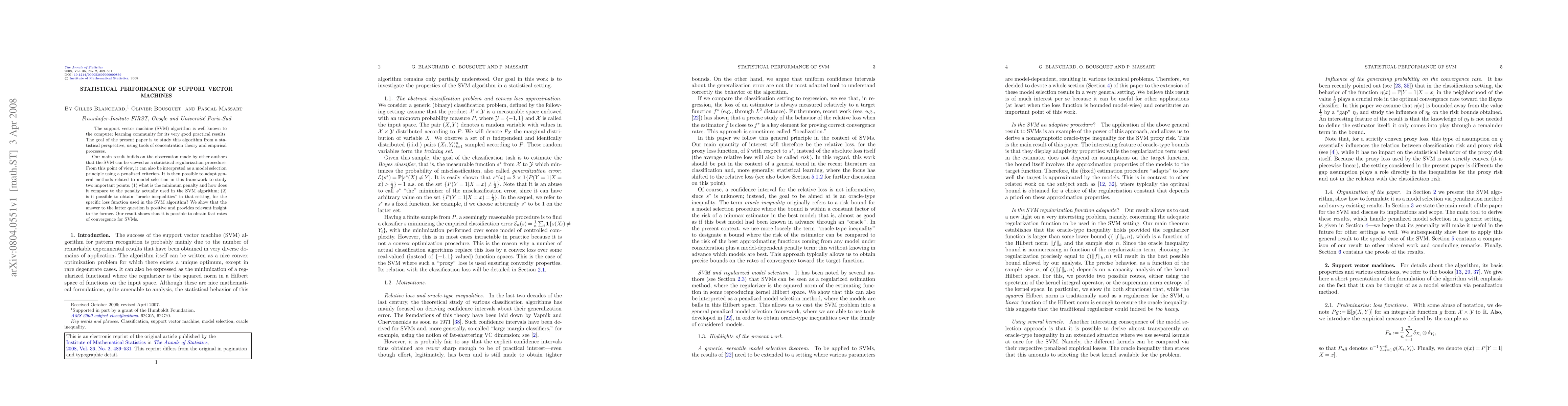 This paper studies the support vector machine algorithm from a statistical perspective, exploring its potential as a regularization procedure with fast rates of convergence. It provides insight into model selection principles using penalized criteria and demonstrates the possibility of obtaining oracle inequalities for the specific loss function used in SVMs.
