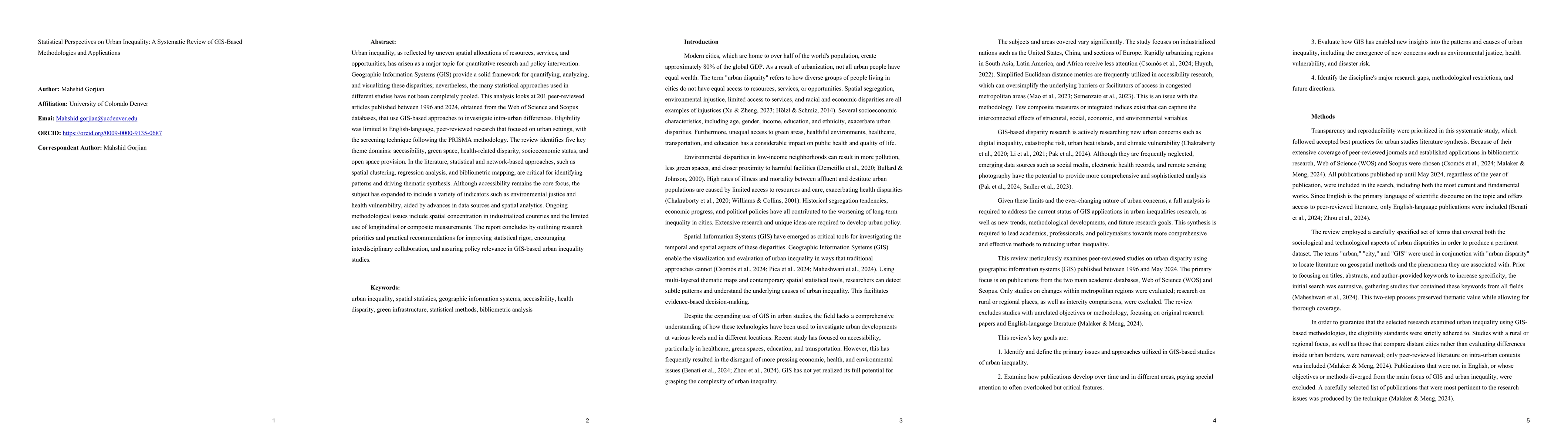This systematic review of 201 GIS-based urban inequality studies from 1996-2024 reveals five key themes: accessibility, green space, health disparities, socioeconomic status, and open space. Statistical methods like clustering and regression analysis are prevalent, with a growing focus on indicators like environmental justice and health vulnerability. Challenges include spatial concentration in industrialized nations and underuse of longitudinal data. The paper suggests prioritizing interdisciplinary collaboration and policy-relevant research.