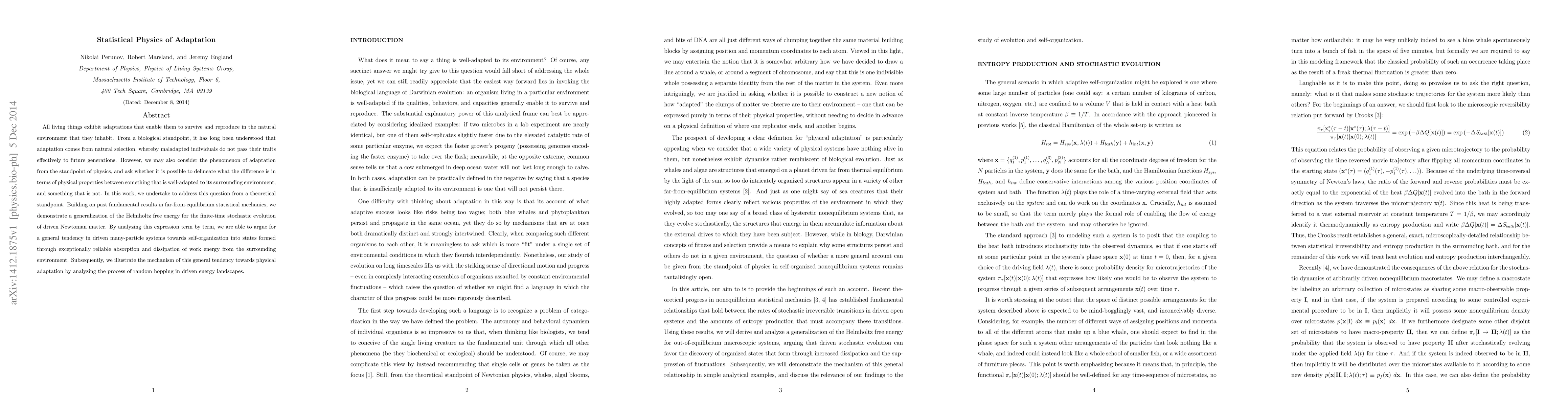 This paper explores the statistical physics of biological adaptation, proposing a theoretical framework to understand the physical properties that differentiate well-adapted organisms from maladapted ones. It generalizes the Helmholtz free energy for driven Newtonian systems, demonstrating a tendency towards self-organization and reliable energy absorption and dissipation in many-particle systems.
