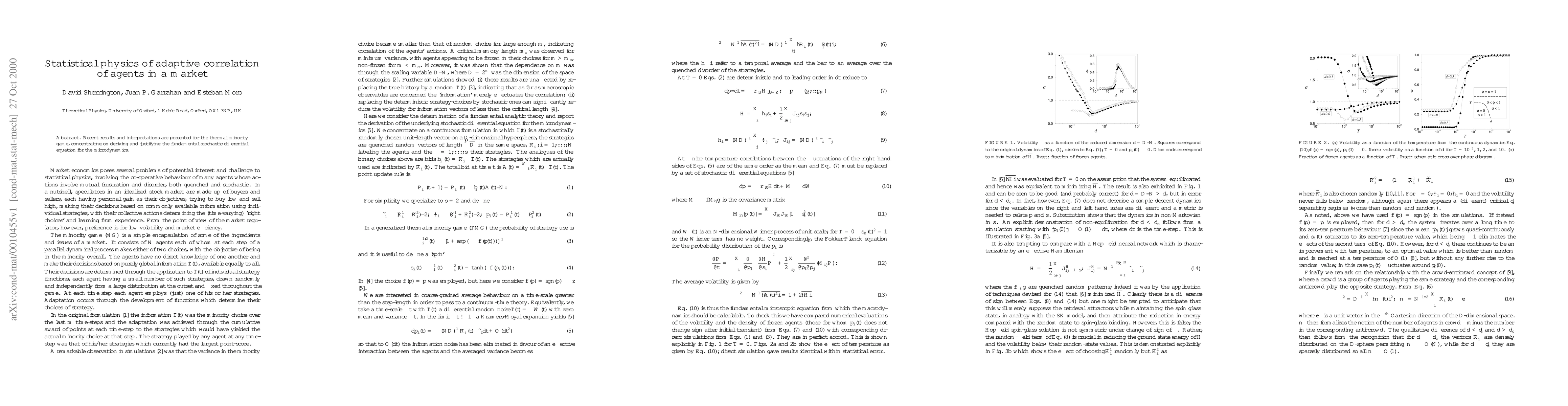 This paper investigates the statistical physics of adaptive correlation in a market, focusing on deriving a fundamental stochastic differential equation for microdynamics in the thermal minority game.
