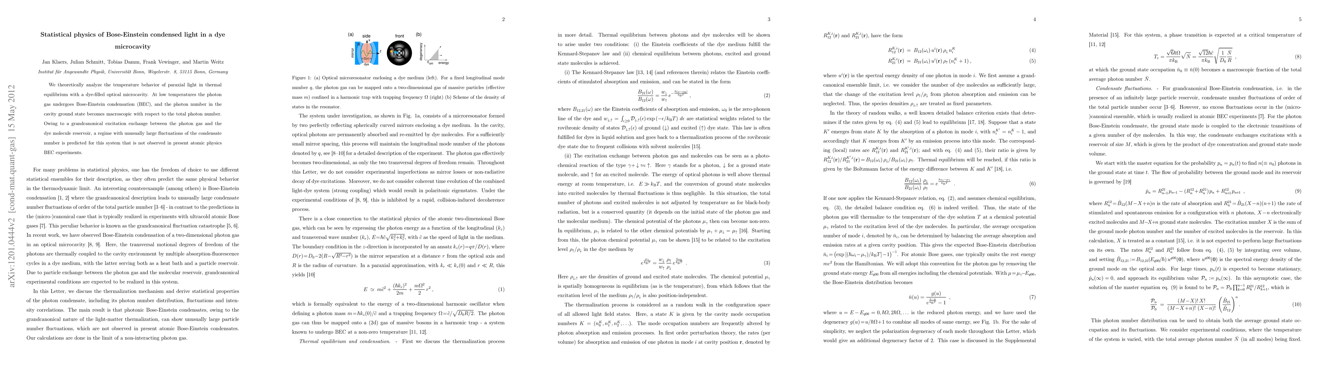 This paper theoretically investigates the temperature-dependent behavior of light in a dye-filled optical microcavity, predicting Bose-Einstein condensation (BEC) at low temperatures and unusually large fluctuations in the photon condensate number due to interactions with dye molecules. This phenomenon differs from typical atomic BEC experiments.