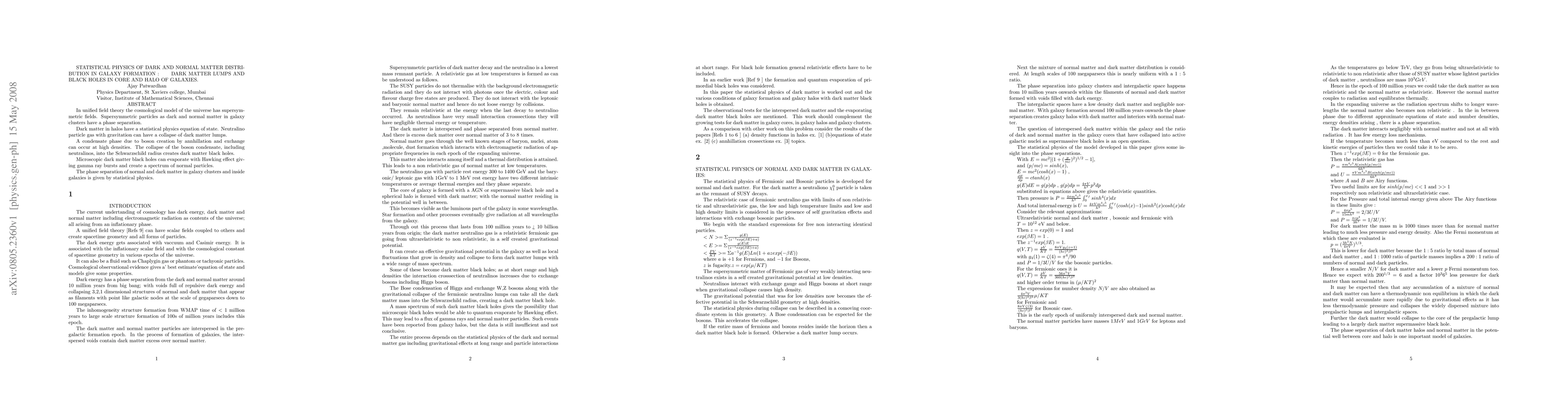 The paper proposes a unified field theory model where dark and normal matter phase-separate in galaxy clusters. Dark matter in galaxy halos follows a statistical physics equation of state, with neutralino particle gas collapsing into dark matter lumps and eventually black holes under high density. These microscopic black holes can evaporate via Hawking radiation, producing gamma-ray bursts and normal particles. The phase separation phenomenon inside galaxies is described using statistical physics.