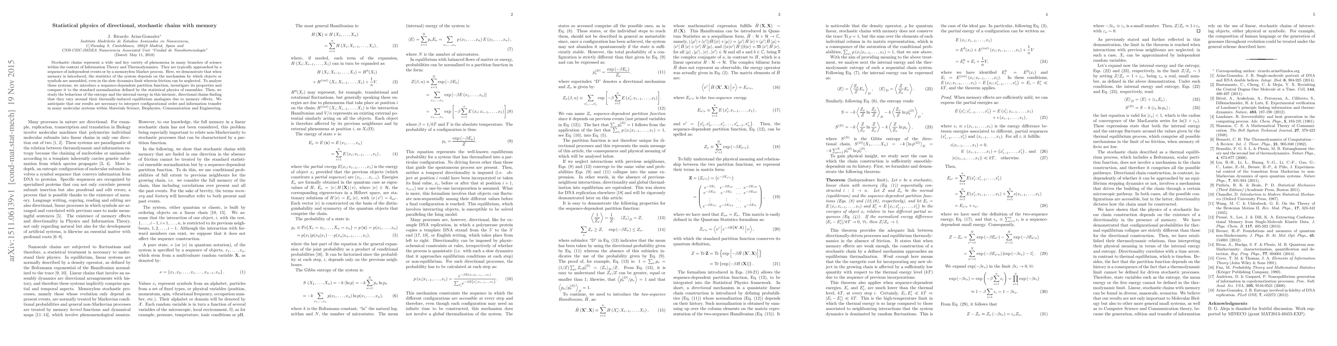 Stochastic chains represent a wide and key variety of phenomena in many branches of science within the context of Information Theory and Thermodynamics. They are typically approached by a sequence of independent events or by a memoryless Markov process. Here, we demonstrate that when memory is introduced, the statistics of the system depends on the mechanism by which objects or symbols are assembled, even in the slow dynamics limit wherein friction can be neglected. To analyse these systems, we introduce a sequence-dependent partition function, investigate its properties and compare it to the standard normalization defined by the statistical physics of ensembles. Then, we study the behaviour of the entropy and the internal energy in this intrinsic, directional chains finding that they vary around their thermally-induced equilibrium analogues due to memory effects. We anticipate that our results are necessary to interpret configurational order and information transfer in many molecular systems within Materials Science, Biophysics, Communication and Engineering.