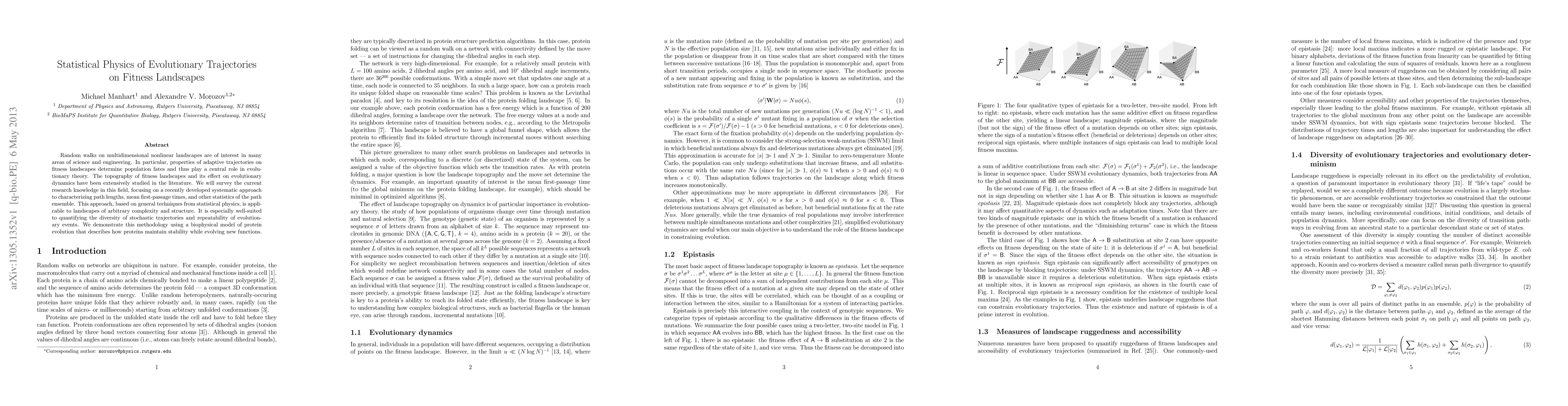 Random walks on multidimensional nonlinear landscapes are of interest in many areas of science and engineering. In particular, properties of adaptive trajectories on fitness landscapes determine population fates and thus play a central role in evolutionary theory. The topography of fitness landscapes and its effect on evolutionary dynamics have been extensively studied in the literature. We will survey the current research knowledge in this field, focusing on a recently developed systematic approach to characterizing path lengths, mean first-passage times, and other statistics of the path ensemble. This approach, based on general techniques from statistical physics, is applicable to landscapes of arbitrary complexity and structure. It is especially well-suited to quantifying the diversity of stochastic trajectories and repeatability of evolutionary events. We demonstrate this methodology using a biophysical model of protein evolution that describes how proteins maintain stability while evolving new functions.