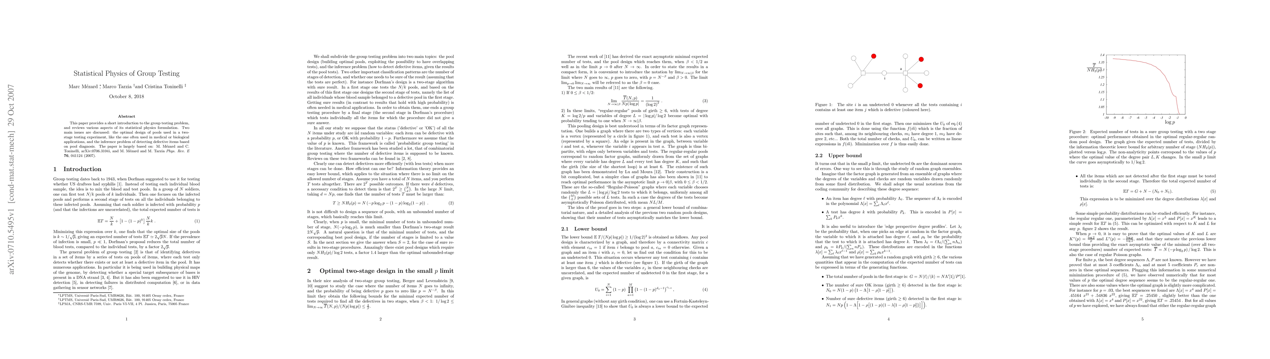 This paper reviews statistical physics approaches to group testing, focusing on pool design optimization and defective item detection, with implications for medical and biological applications.