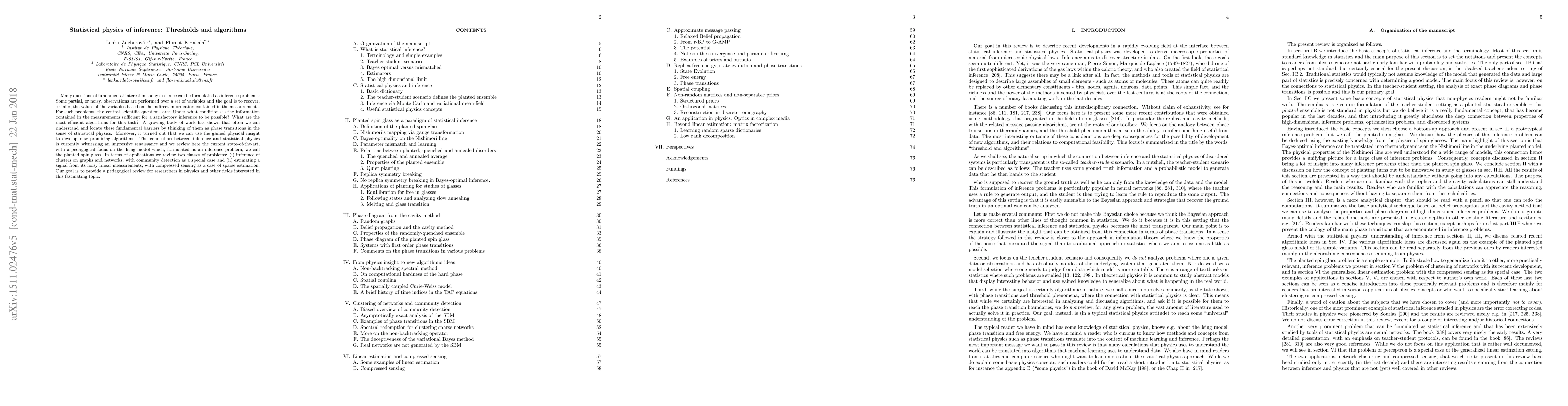 This paper reviews the intersection of statistical physics and inference problems, focusing on the thresholds and algorithms for recovering hidden variables from noisy observations. It highlights the Ising model as a key framework and discusses applications in community detection and compressed sensing.