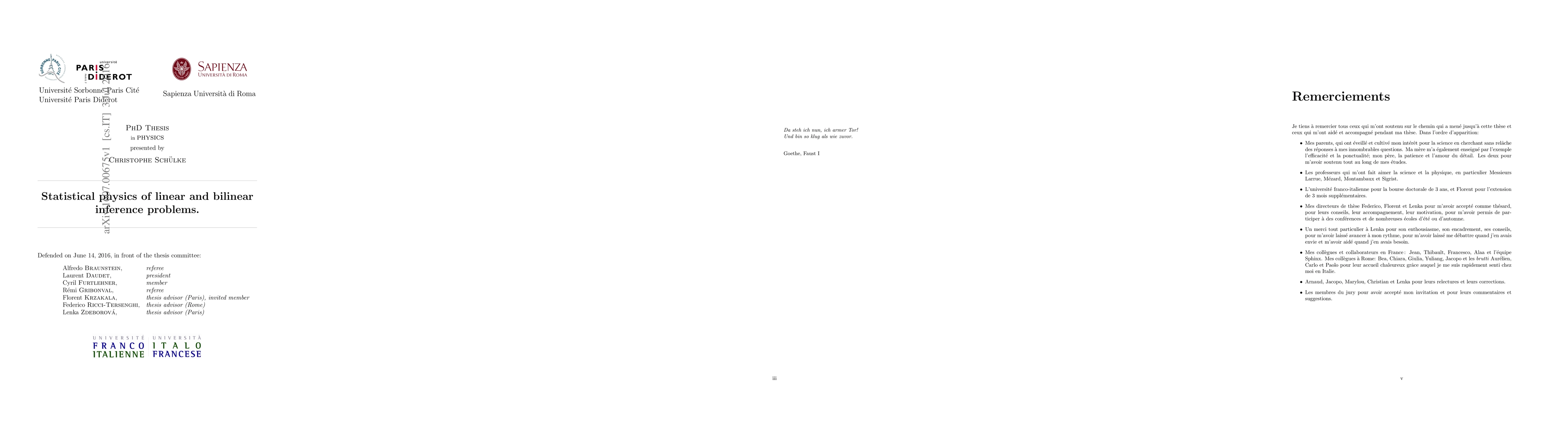 This paper explores the statistical physics of linear and bilinear inference problems, focusing on efficient algorithms and their theoretical analysis. It applies belief propagation to tackle problems like community detection, blind sensor calibration, and imaging systems, revealing phase transitions and energy landscapes analogous to physical systems.