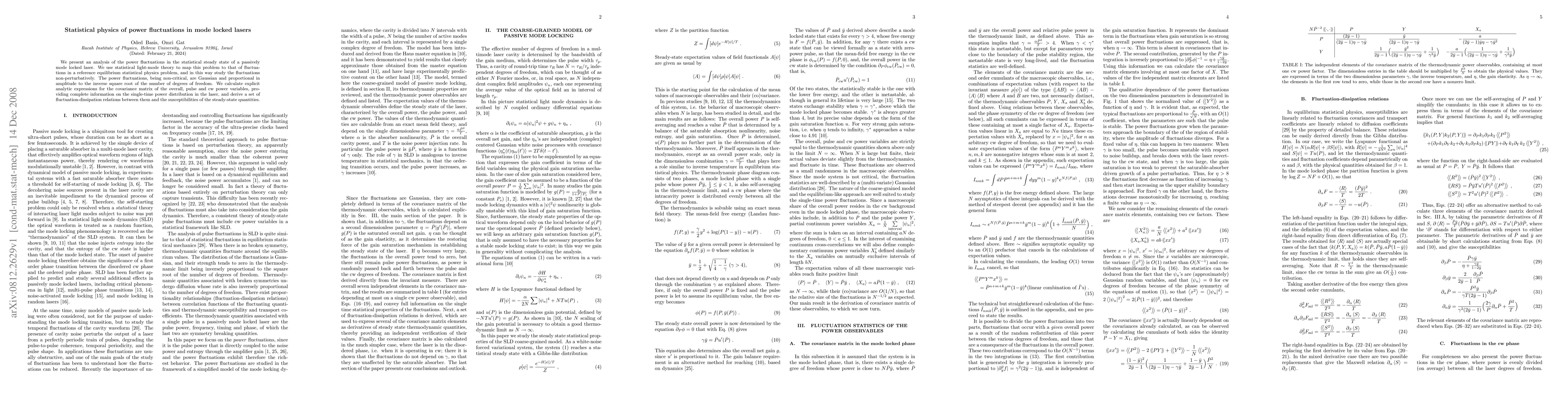 We present an analysis of the power fluctuations in the statistical steady state of a passively mode locked laser. We use statistical light-mode theory to map this problem to that of fluctuations in a reference equilibrium statistical physics problem, and in this way study the fluctuations non-perturbatively. The power fluctuations, being non-critical, are Gaussian and proportional in amplitude to the inverse square root of the number of degrees of freedom. We calculate explicit analytic expressions for the covariance matrix of the overall, pulse and cw power variables, providing complete information on the single-time power distribution in the laser, and derive a set of fluctuation-dissipation relations between them and the susceptibilities of the steady-state quantities.