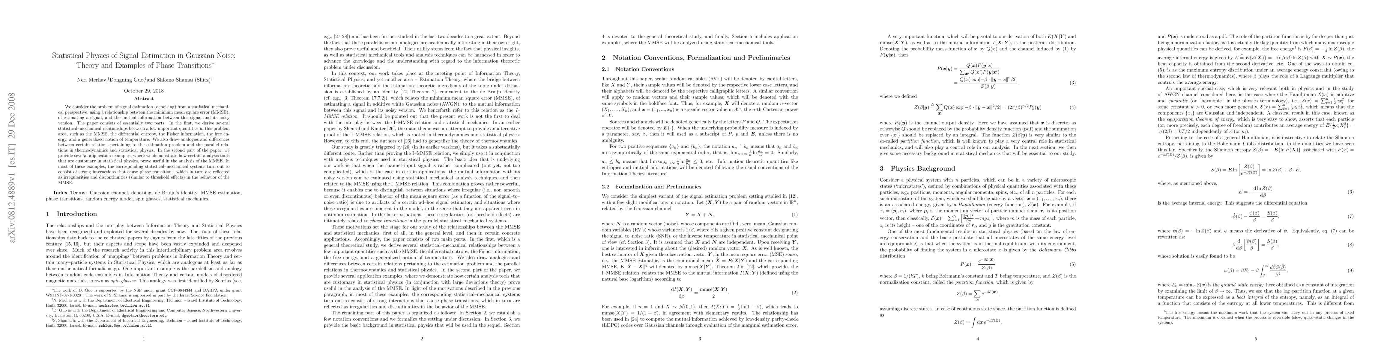 This paper explores signal estimation in Gaussian noise through a statistical-mechanical lens, deriving relationships between MMSE, entropy, and information. It demonstrates phase transitions in statistical-mechanical systems that correspond to irregularities in MMSE behavior, akin to threshold effects.