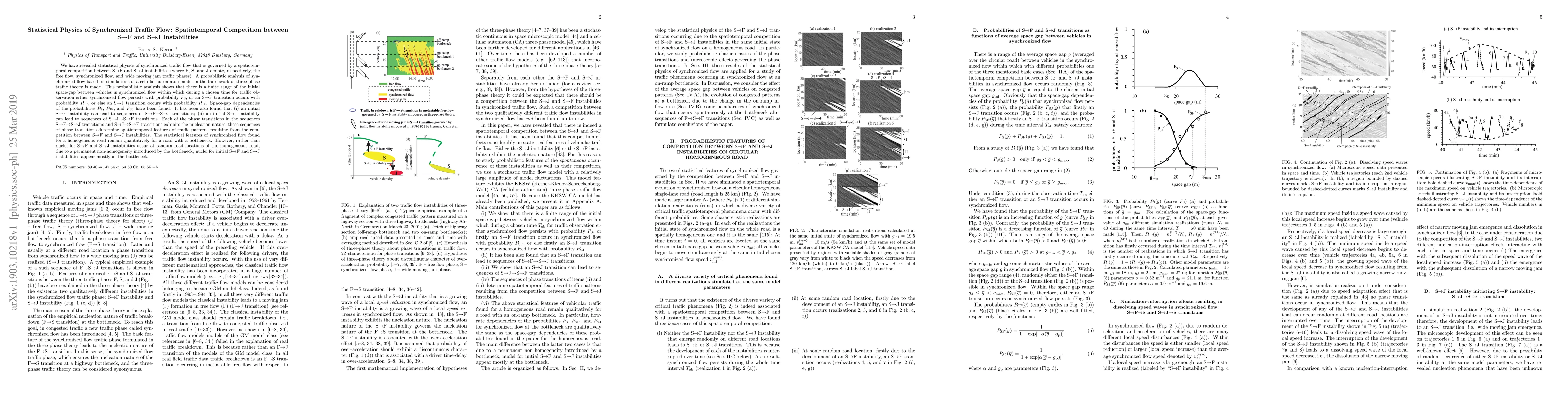 This paper investigates the statistical physics of synchronized traffic flow, revealing the spatiotemporal competition between S$\rightarrow$F and S$\rightarrow$J instabilities using a cellular automaton model. The probabilistic analysis shows that transitions between traffic phases depend on initial space-gaps, with distinct probabilities for persistence of synchronized flow, transitions to free flow, and transitions to wide moving jams.