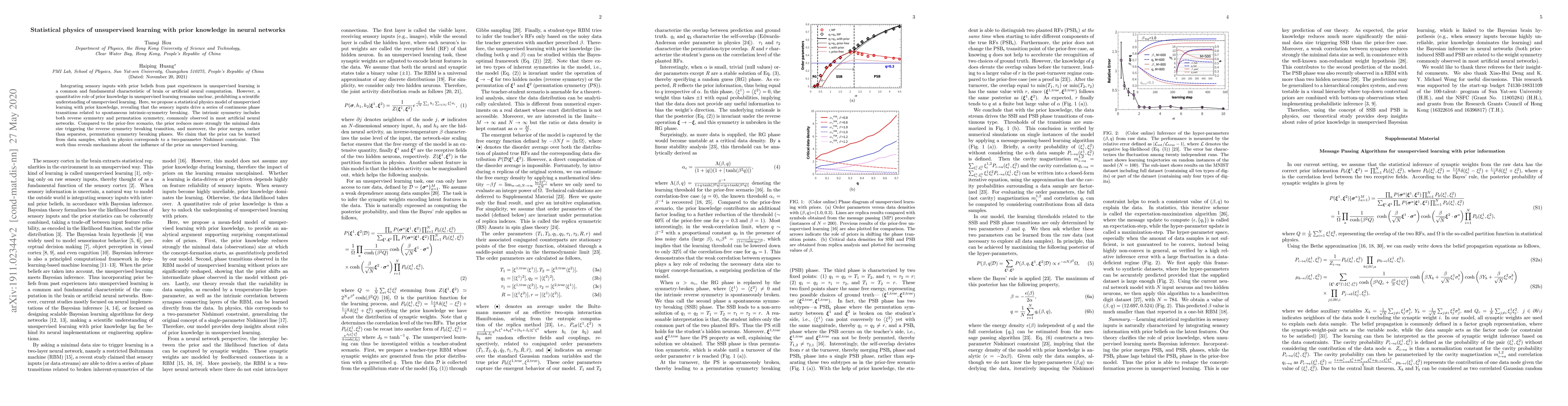 This paper proposes a statistical physics model to understand how prior knowledge influences unsupervised learning in neural networks, showing that priors can reduce the data size needed for symmetry breaking and merge symmetry phases, providing insights into the role of priors in neural computation.