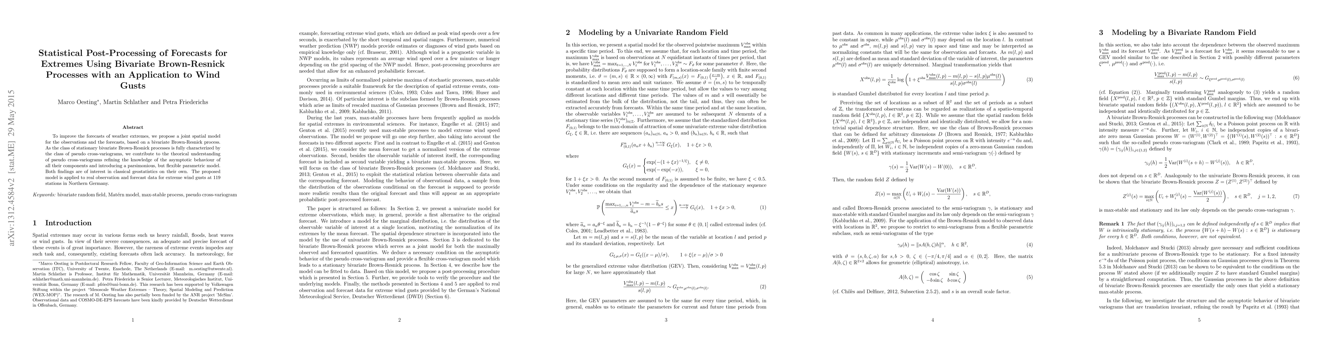 To improve the forecasts of weather extremes, we propose a joint spatial model for the observations and the forecasts, based on a bivariate Brown-Resnick process. As the class of stationary bivariate Brown-Resnick processes is fully characterized by the class of pseudo cross-variograms, we contribute to the theorical understanding of pseudo cross-variograms refining the knowledge of the asymptotic behaviour of all their components and introducing a parsimonious, but flexible parametric model. Both findings are of interest in classical geostatistics on their own. The proposed model is applied to real observation and forecast data for extreme wind gusts at 119 stations in Northern Germany.