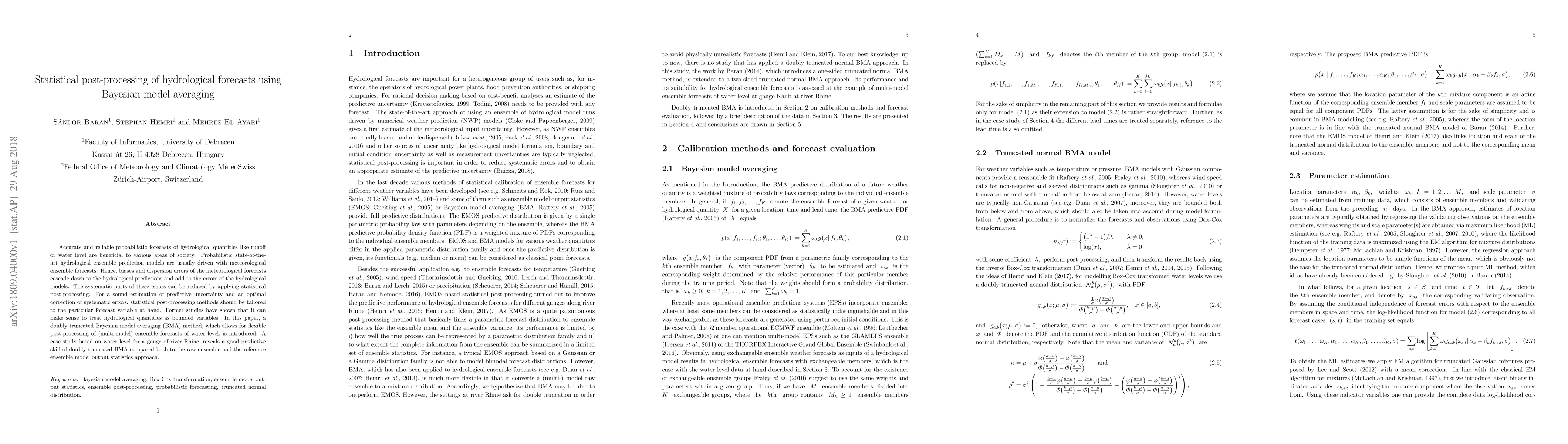 This paper introduces a doubly truncated Bayesian model averaging method for statistical post-processing of hydrological ensemble forecasts to correct systematic errors and improve predictive uncertainty. The method shows better predictive skill for water level forecasts compared to raw ensemble forecasts and the reference model output statistics approach, as demonstrated in a case study on the Rhine river.