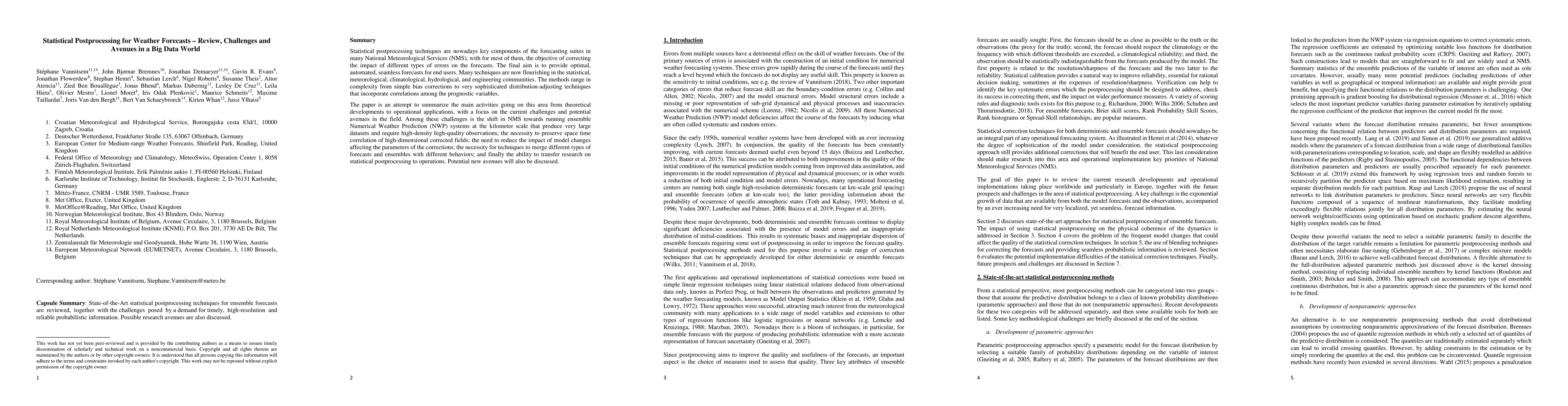 Statistical postprocessing techniques are nowadays key components of the forecasting suites in many National Meteorological Services (NMS), with for most of them, the objective of correcting the impact of different types of errors on the forecasts. The final aim is to provide optimal, automated, seamless forecasts for end users. Many techniques are now flourishing in the statistical, meteorological, climatological, hydrological, and engineering communities. The methods range in complexity from simple bias corrections to very sophisticated distribution-adjusting techniques that incorporate correlations among the prognostic variables. The paper is an attempt to summarize the main activities going on this area from theoretical developments to operational applications, with a focus on the current challenges and potential avenues in the field. Among these challenges is the shift in NMS towards running ensemble Numerical Weather Prediction (NWP) systems at the kilometer scale that produce very large datasets and require high-density high-quality observations; the necessity to preserve space time correlation of high-dimensional corrected fields; the need to reduce the impact of model changes affecting the parameters of the corrections; the necessity for techniques to merge different types of forecasts and ensembles with different behaviors; and finally the ability to transfer research on statistical postprocessing to operations. Potential new avenues will also be discussed.