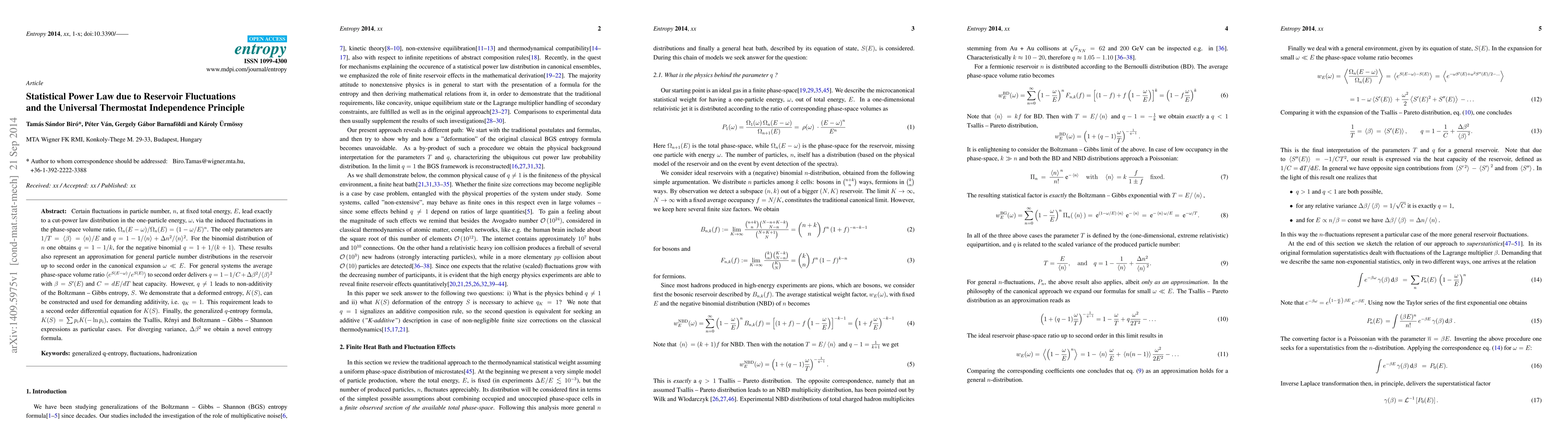 Certain fluctuations in particle number at fixed total energy lead exactly to a cut-power law distribution in the one-particle energy, via the induced fluctuations in the phase-space volume ratio. The temperature parameter is expressed automatically by an equipartition relation, while the q-parameter is related to the scaled variance and to the expectation value of the particle number. For the binomial distribution q is smaller, for the negative binomial q is larger than one. These results also represent an approximation for general particle number distributions in the reservoir up to second order in the canonical expansion. For general systems the average phase-space volume ratio expanded to second order delivers a q parameter related to the heat capacity and to the variance of the temperature. However, q differing from one leads to non-additivity of the Boltzmann-Gibbs entropy. We demonstrate that a deformed entropy, K(S), can be constructed and used for demanding additivity. This requirement leads to a second order differential equation for K(S). Finally, the generalized q-entropy formula contains the Tsallis, Renyi and Boltzmann-Gibbs-Shannon expressions as particular cases. For diverging temperature variance we obtain a novel entropy formula.