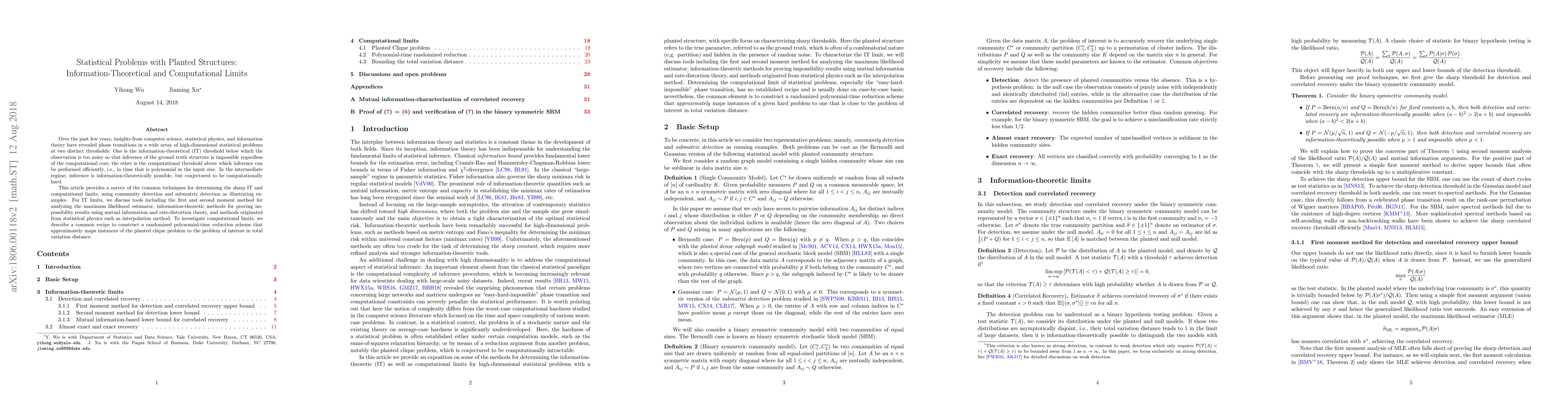 This paper surveys techniques for determining the information-theoretic and computational limits in statistical problems with planted structures, using examples like community detection. It covers methods for proving information-theoretic limits and constructing randomized reductions for computational limits.