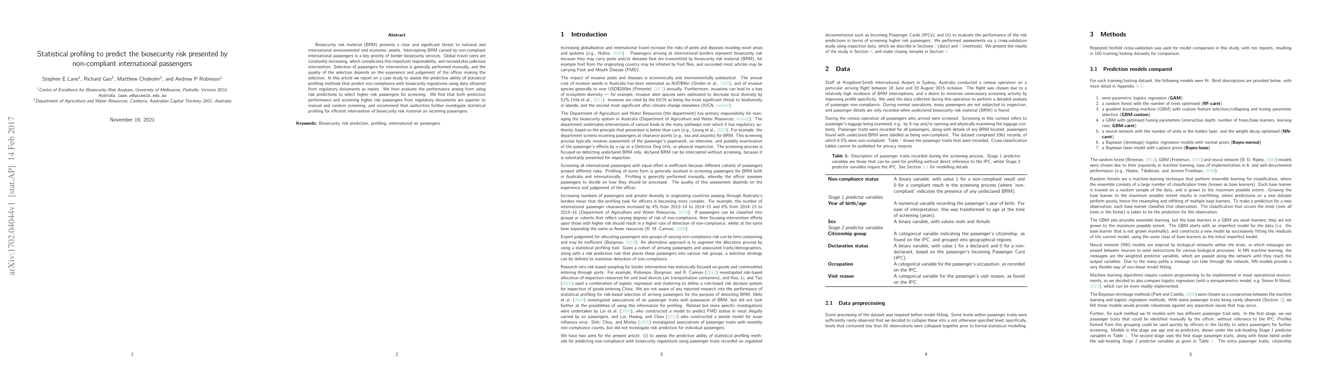 Biosecurity risk material (BRM) presents a clear and significant threat to national and international environmental and economic assets. Intercepting BRM carried by non-compliant international passengers is a key priority of border biosecurity services. Global travel rates are constantly increasing, which complicates this important responsibility, and necessitates judicious intervention. Selection of passengers for intervention is generally performed manually, and the quality of the selection depends on the experience and judgement of the officer making the selection. In this article we report on a case study to assess the predictive ability of statistical profiling methods that predict non-compliance with biosecurity regulations using data obtained from regulatory documents as inputs. We then evaluate the performance arising from using risk predictions to select higher risk passengers for screening. We find that both prediction performance and screening higher risk passengers from regulatory documents are superior to manual and random screening, and recommend that authorities further investigate statistical profiling for efficient intervention of biosecurity risk material on incoming passengers.