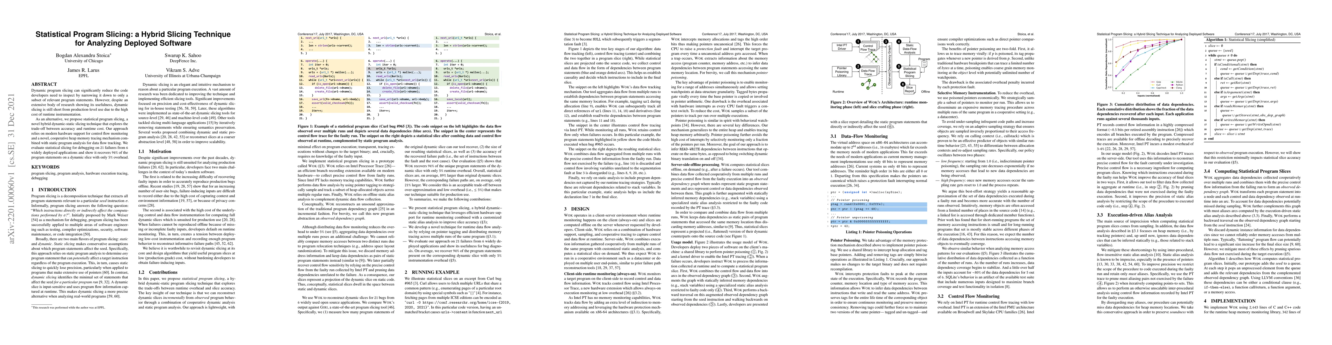 This paper introduces statistical program slicing, a hybrid dynamic-static technique that balances accuracy and runtime cost for debugging deployed software. The method leverages hardware support and a cooperative heap memory tracing mechanism, achieving 94% recovery of relevant code while introducing only 5% overhead.