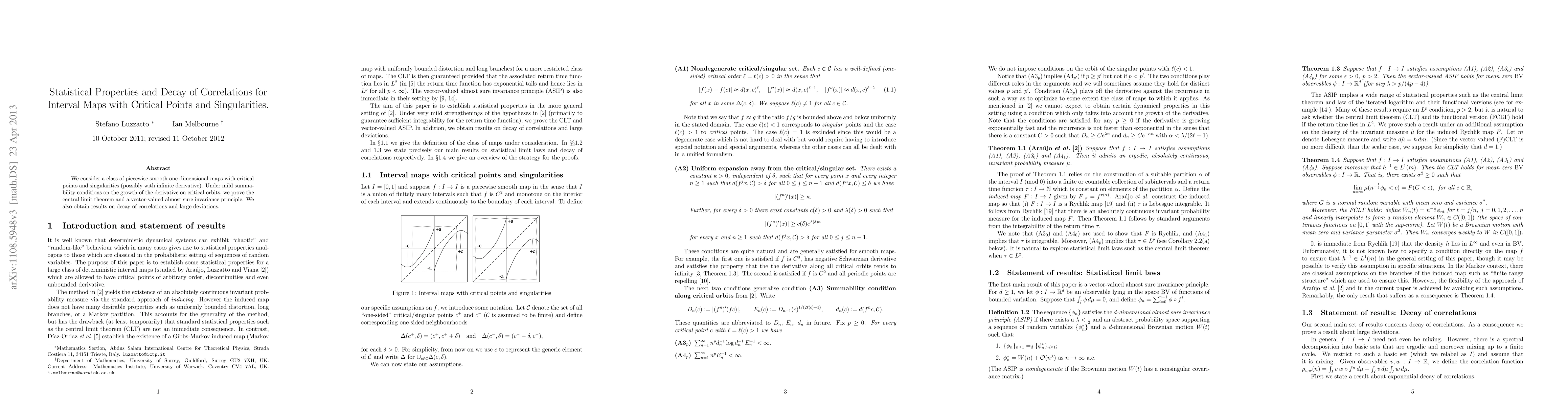 We consider a class of piecewise smooth one-dimensional maps with critical points and singularities (possibly with infinite derivative). Under mild summability conditions on the growth of the derivative on critical orbits, we prove the central limit theorem and a vector-valued almost sure invariance principle. We also obtain results on decay of correlations.