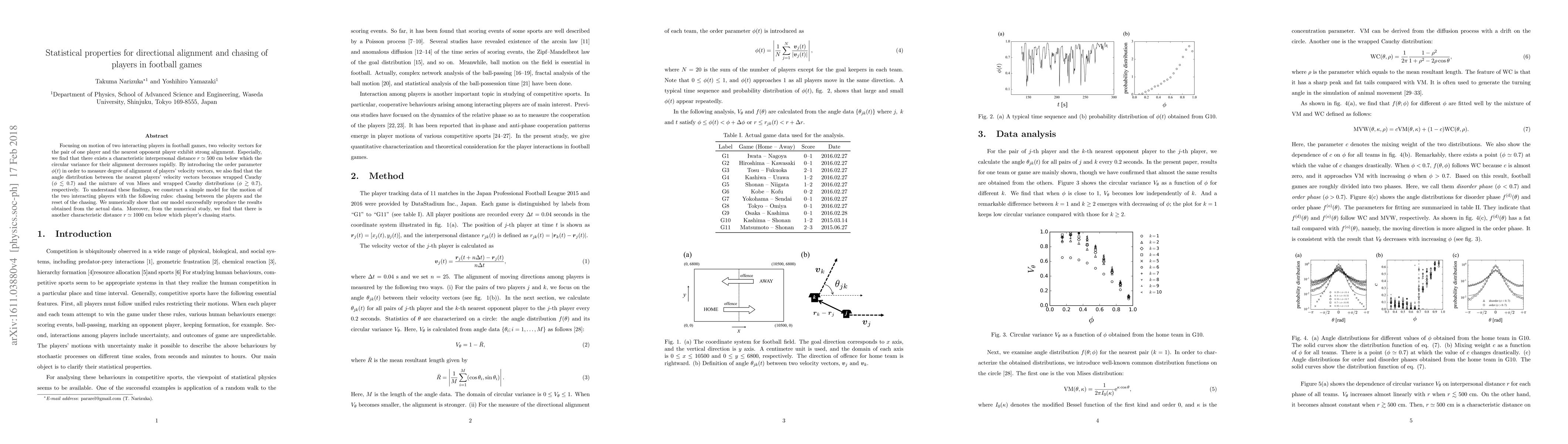 Focusing on motion of two interacting players in football games, two velocity vectors for the pair of one player and the nearest opponent player exhibit strong alignment. Especially, we find that there exists a characteristic interpersonal distance $ r\simeq 500 $ cm below which the circular variance for their alignment decreases rapidly. By introducing the order parameter $ \phi(t) $ in order to measure degree of alignment of players' velocity vectors, we also find that the angle distribution between the nearest players' velocity vectors becomes wrapped Cauchy ($ \phi \lesssim 0.7 $) and the mixture of von Mises and wrapped Cauchy distributions ($ \phi \gtrsim 0.7 $), respectively. To understand these findings, we construct a simple model for the motion of the two interacting players with the following rules: chasing between the players and the reset of the chasing. We numerically show that our model successfully reproduce the results obtained from the actual data. Moreover, from the numerical study, we find that there is another characteristic distance $ r\simeq 1000 $ cm below which player's chasing starts.