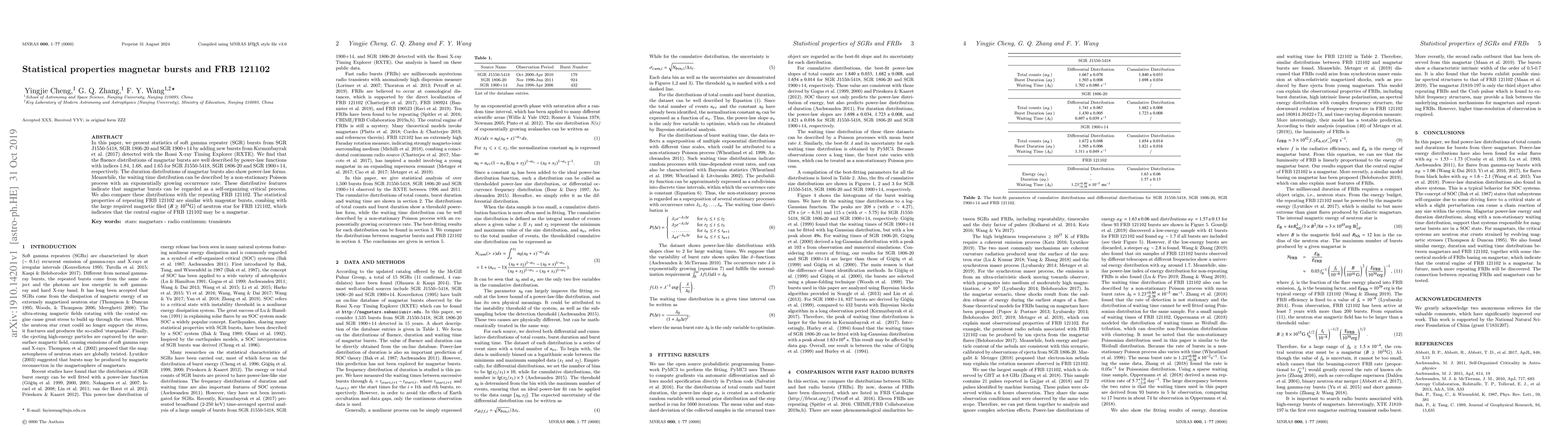 The paper presents a detailed statistical analysis of magnetar bursts and compares their properties with those of the repeating FRB 121102, proposing that FRB 121102's central engine might be a magnetar.