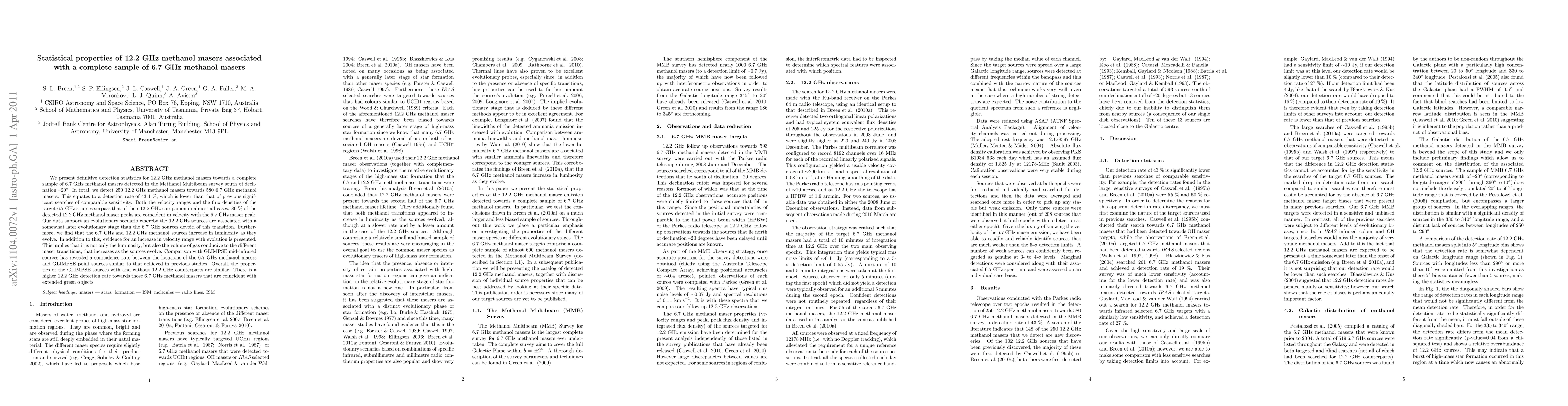 We present definitive detection statistics for 12.2 GHz methanol masers towards a complete sample of 6.7 GHz methanol masers detected in the Methanol Multibeam survey south of declination -20 degrees. In total, we detect 250 12.2 GHz methanol masers towards 580 6.7 GHz methanol masers. This equates to a detection rate of 43.1%, which is lower than that of previous significant searches of comparable sensitivity. Both the velocity ranges and the flux densities of the target 6.7 GHz sources surpass that of their 12.2 GHz companion in almost all cases. 80 % of the detected 12.2 GHz methanol maser peaks are coincident in velocity with the 6.7 GHz maser peak. Our data support an evolutionary scenario whereby the 12.2 GHz sources are associated with a somewhat later evolutionary stage than the 6.7 GHz sources devoid of this transition. Furthermore, we find that the 6.7 GHz and 12.2 GHz methanol sources increase in luminosity as they evolve. In addition to this, evidence for an increase in velocity range with evolution is presented. This implies that it is not only the luminosity, but also the volume of gas conducive to the different maser transitions, that increases as the sources evolve. Comparison with GLIMPSE mid-infrared sources has revealed a coincidence rate between the locations of the 6.7 GHz methanol masers and GLIMPSE point sources similar to that achieved in previous studies. Overall, the properties of the GLIMPSE sources with and without 12.2 GHz counterparts are similar. There is a higher 12.2 GHz detection rate towards those 6.7 GHz methanol masers that are coincident with extended green objects.