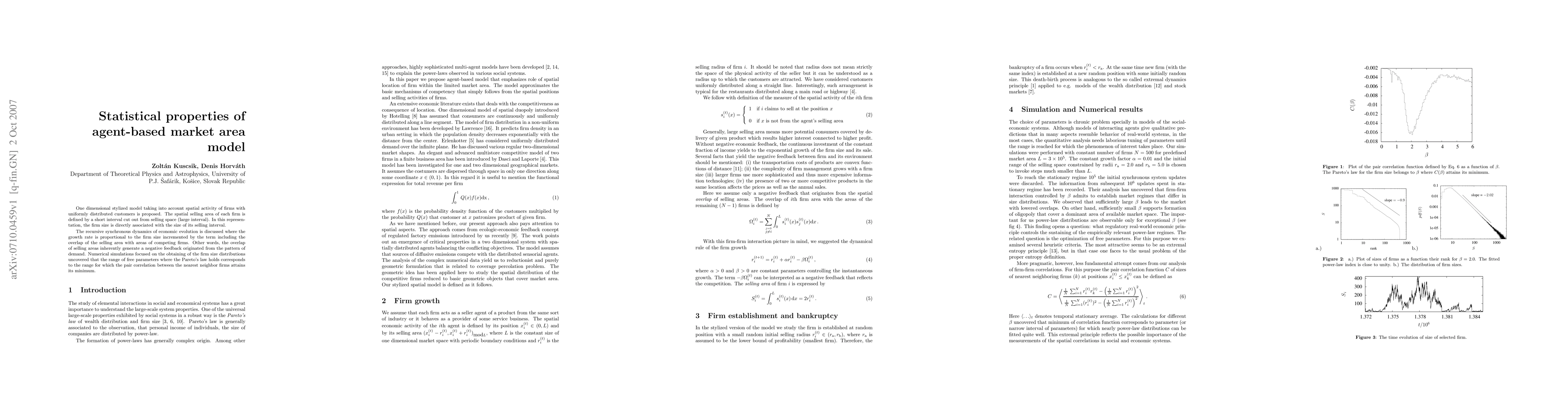 One dimensional stylized model taking into account spatial activity of firms with uniformly distributed customers is proposed. The spatial selling area of each firm is defined by a short interval cut out from selling space (large interval). In this representation, the firm size is directly associated with the size of its selling interval. The recursive synchronous dynamics of economic evolution is discussed where the growth rate is proportional to the firm size incremented by the term including the overlap of the selling area with areas of competing firms. Other words, the overlap of selling areas inherently generate a negative feedback originated from the pattern of demand. Numerical simulations focused on the obtaining of the firm size distributions uncovered that the range of free parameters where the Pareto's law holds corresponds to the range for which the pair correlation between the nearest neighbor firms attains its minimum.