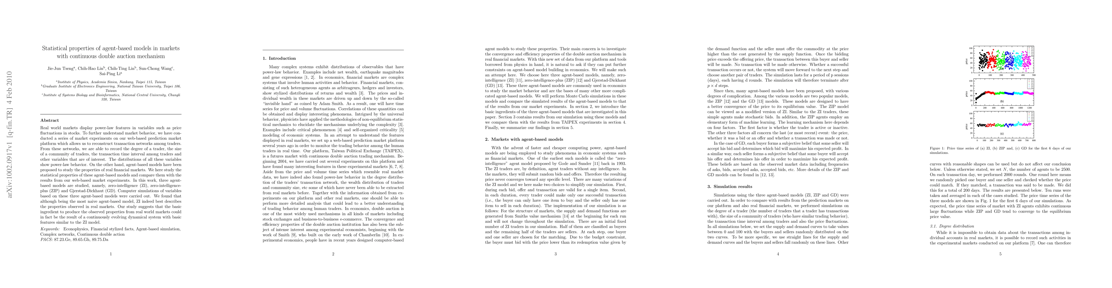 Real world markets display power-law features in variables such as price fluctuations in stocks. To further understand market behavior, we have conducted a series of market experiments on our web-based prediction market platform which allows us to reconstruct transaction networks among traders. From these networks, we are able to record the degree of a trader, the size of a community of traders, the transaction time interval among traders and other variables that are of interest. The distributions of all these variables show power-law behavior. On the other hand, agent-based models have been proposed to study the properties of real financial markets. We here study the statistical properties of these agent-based models and compare them with the results from our web-based market experiments. In this work, three agent-based models are studied, namely, zero-intelligence (ZI), zero-intelligence-plus (ZIP) and Gjerstad-Dickhaut (GD). Computer simulations of variables based on these three agent-based models were carried out. We found that although being the most naive agent-based model, ZI indeed best describes the properties observed in real markets. Our study suggests that the basic ingredient to produce the observed properties from real world markets could in fact be the result of a continuously evolving dynamical system with basic features similar to the ZI model.
