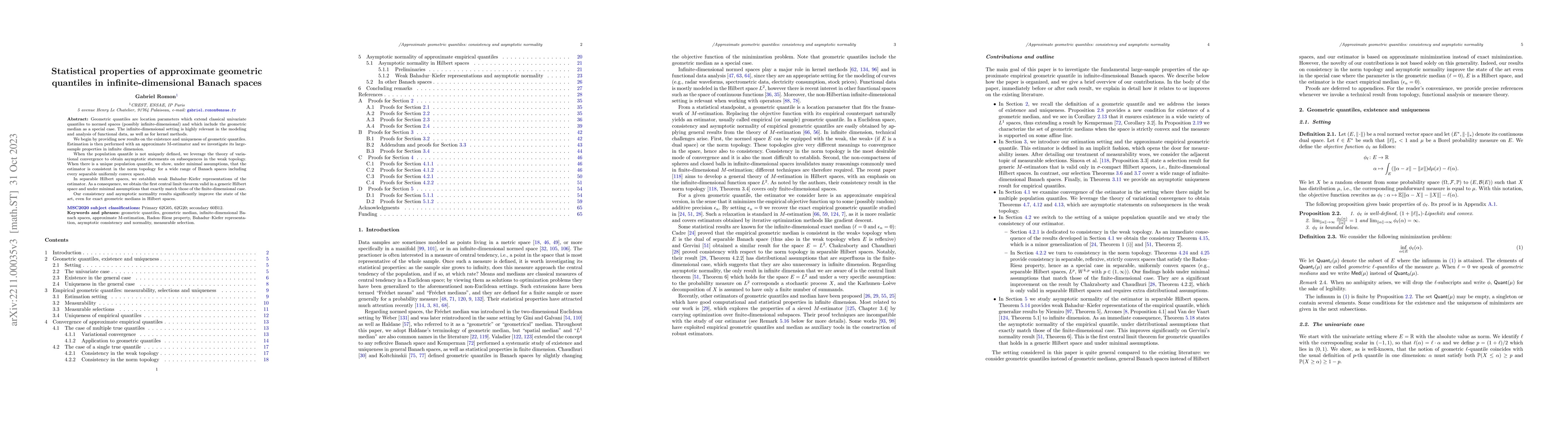 This paper investigates the statistical properties of approximate geometric quantiles in infinite-dimensional Banach spaces, establishing existence, uniqueness, and consistency of estimators. It provides the first central limit theorem in a generic Hilbert space, significantly advancing the understanding of geometric quantiles in infinite dimensions.