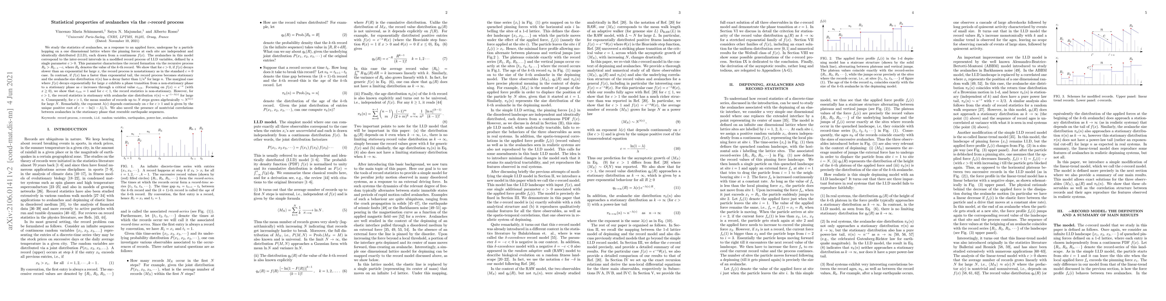 This paper investigates the statistical properties of avalanches in a particle hopping model on a one-dimensional lattice, framed through a modified record process characterized by parameter $c$. For $c>0$, it reveals a transition from nonstationary to stationary behavior depending on the tail decay of the pinning force distribution $f(x)$, with an exponential decay leading to a critical value $c_{\rm crit}=1$. The stationary regime ($c>1$) exhibits an avalanche size distribution and nontrivial correlations akin to earthquake sequences.