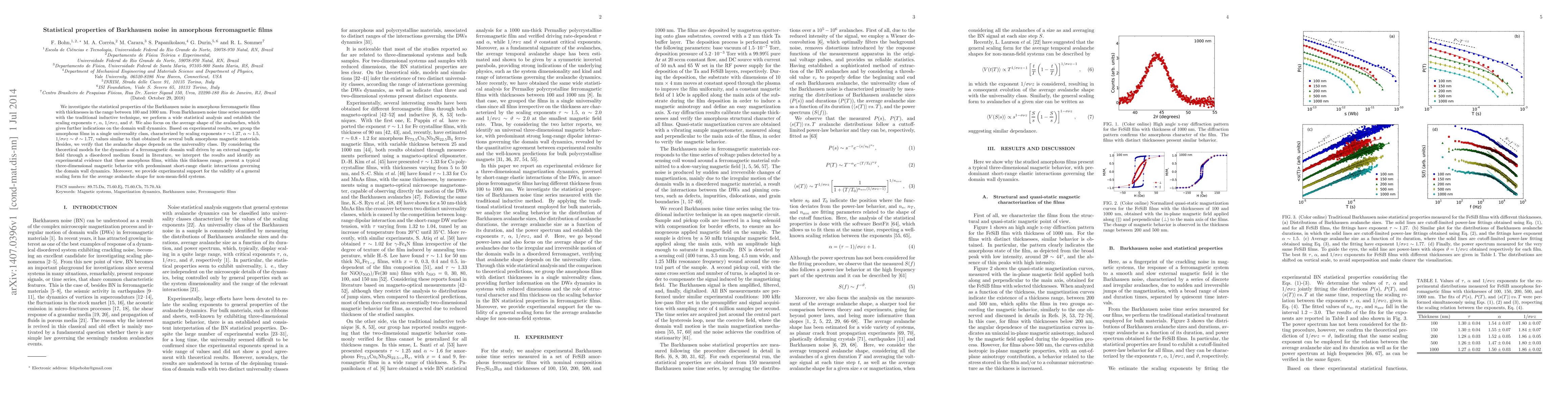 This study investigates the statistical properties of Barkhausen noise in amorphous ferromagnetic films, establishing scaling exponents and analyzing avalanche shapes. The research groups these films into a single universality class, indicating typical three-dimensional magnetic behavior governed by short-range elastic interactions.