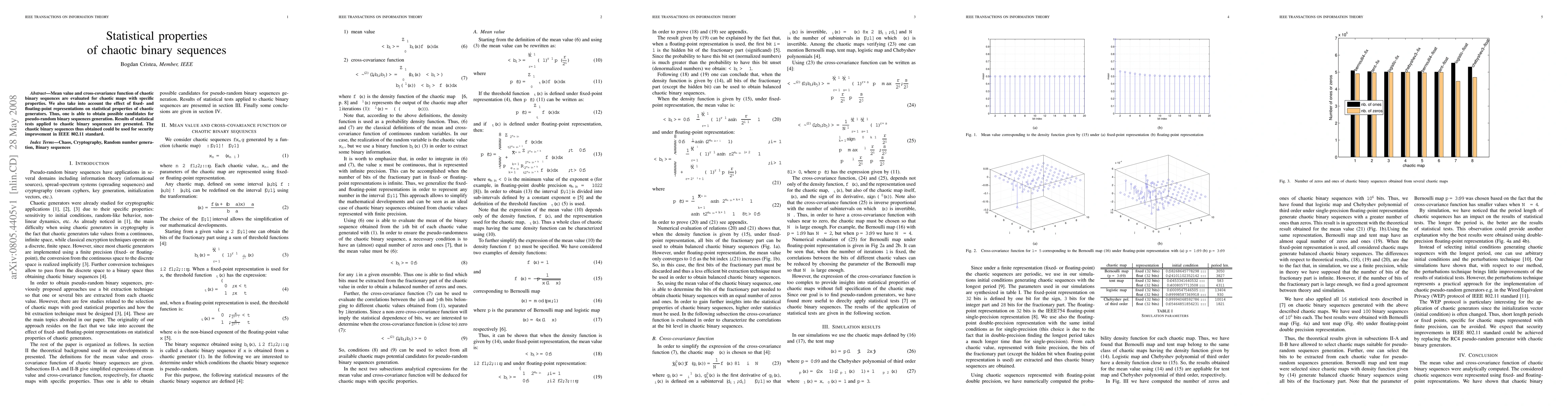 Mean value and cross-covariance function of chaotic binary sequences are evaluated for chaotic maps with specific properties. We also take into account the effect of fixed- and floating-point representations on statistical properties of chaotic generators. Thus, one is able to obtain possible candidates for pseudo-random binary sequences generation. Results of statistical tests applied to chaotic binary sequences are presented. The chaotic binary sequences thus obtained could be used for security improvement in IEEE 802.11 standard.