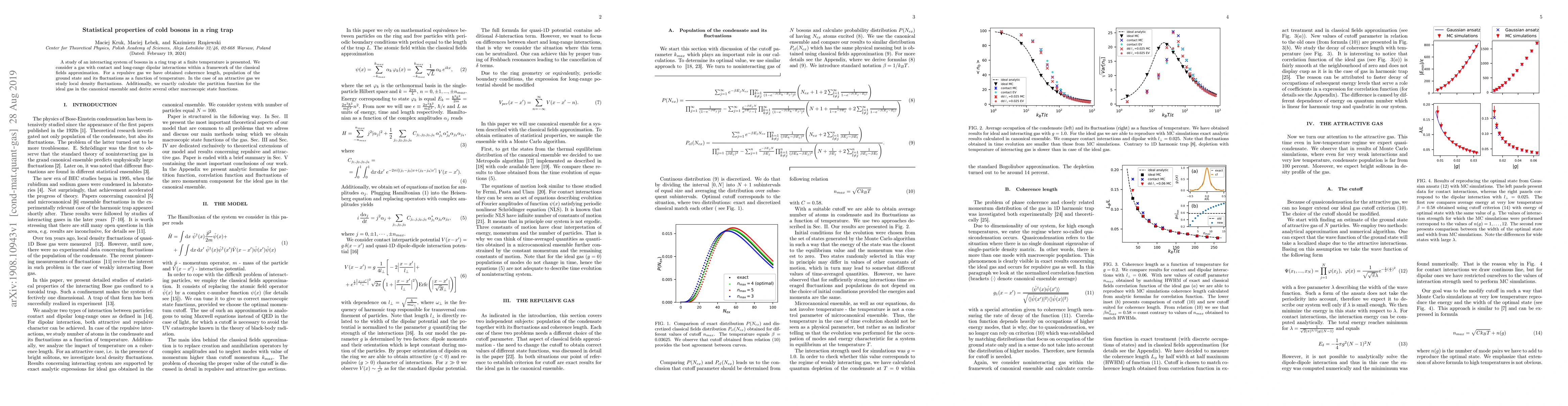 Researchers studied a ring trap holding bosons with repulsive and attractive interactions at finite temperatures, finding coherence length, ground state population, and density fluctuations. They also calculated the ideal gas partition function for an attractive gas.