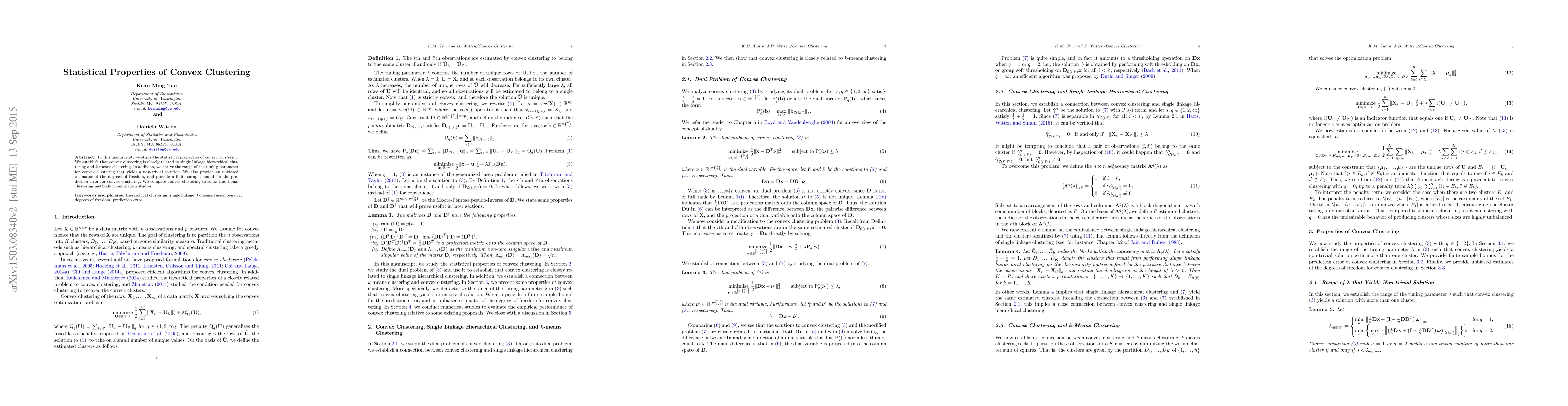 This paper investigates the statistical properties of convex clustering, demonstrating its connections to single linkage and $k$-means clustering, and provides a range for its tuning parameter, an unbiased degrees of freedom estimate, and a finite sample prediction error bound. Simulation studies compare convex clustering to traditional methods.