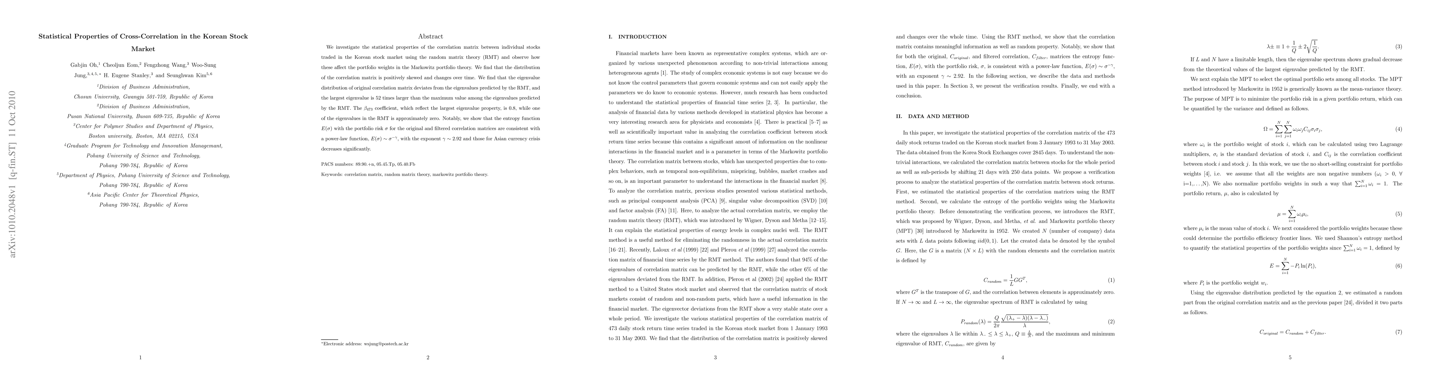 The study investigates statistical properties of cross-correlation in the Korean stock market, finding a positively skewed correlation matrix that deviates from random matrix theory predictions, with one eigenvalue being 52 times larger than expected.