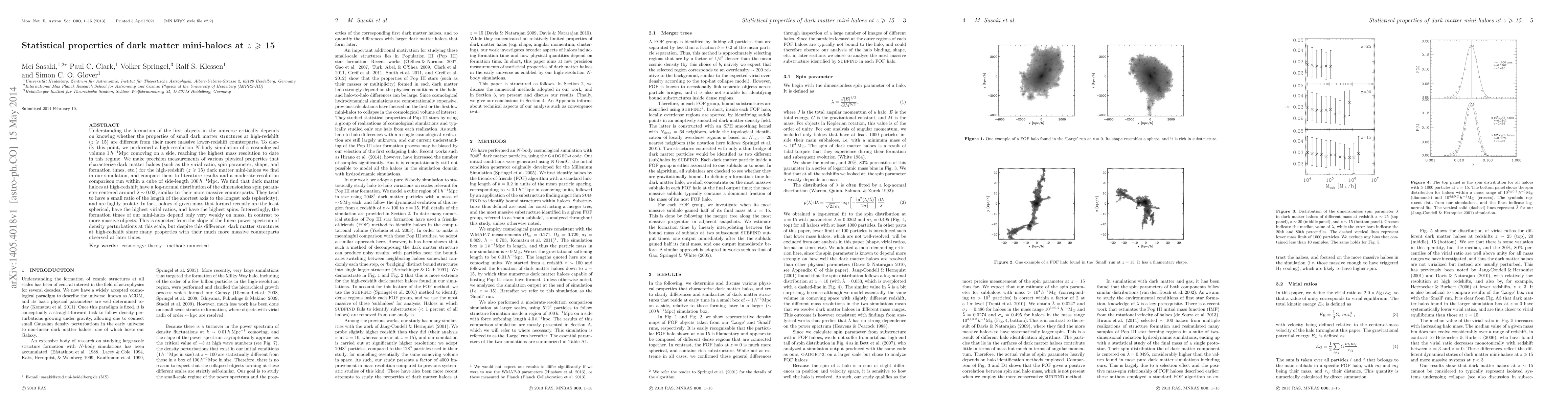 This paper investigates the statistical properties of dark matter mini-haloes at high redshifts (z ≥ 15) using high-resolution N-body simulations. It finds that these mini-haloes exhibit a log-normal distribution of spin parameters and share many properties with more massive counterparts, despite their formation times depending weakly on mass.