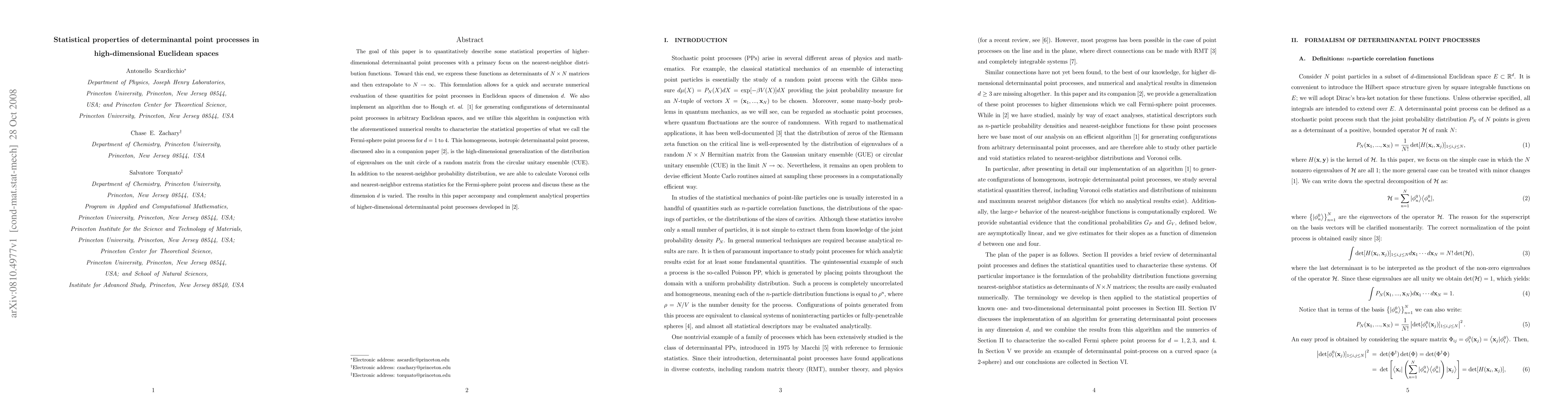 This paper quantitatively describes the statistical properties of high-dimensional determinantal point processes, focusing on the nearest-neighbor distribution functions. It employs matrix determinant formulations and numerical extrapolation to analyze these properties in Euclidean spaces, implementing an algorithm to generate configurations and characterize the Fermi-sphere point process across dimensions 1 to 4.
