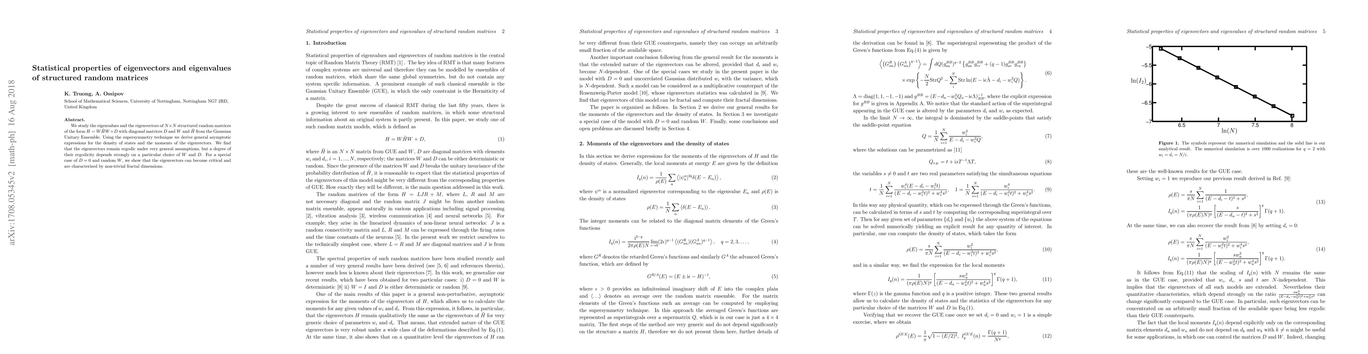 This paper investigates the statistical properties of eigenvalues and eigenvectors in structured random matrices, revealing that while eigenvectors generally remain ergodic, their degree of ergodicity is sensitive to the choice of diagonal matrices. Special cases show eigenvectors can exhibit fractal dimensions, particularly when $D=0$ and $W$ is random.