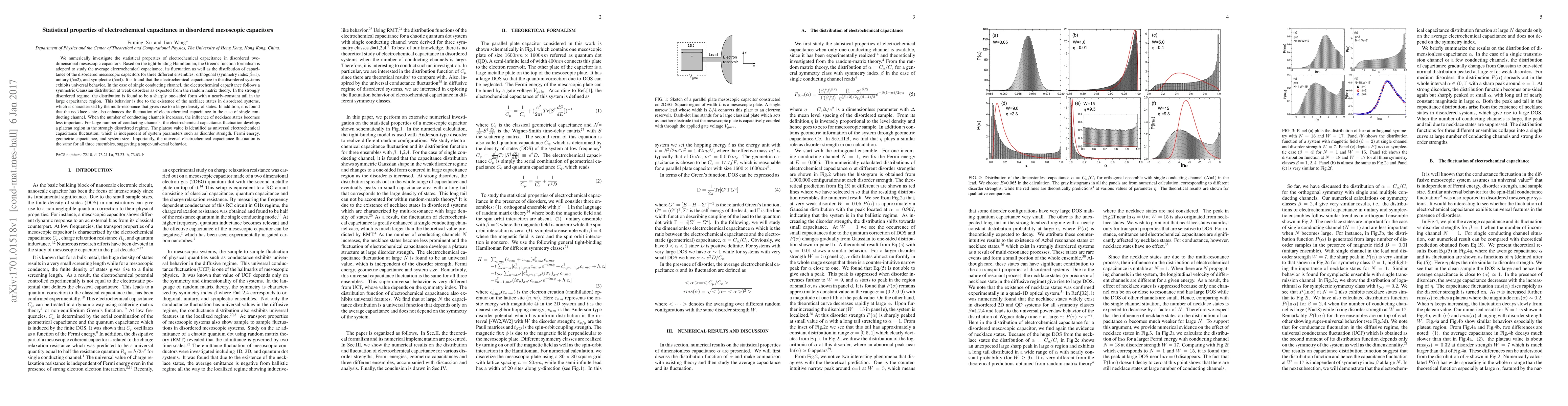 We numerically investigate the statistical properties of electrochemical capacitance in disordered two-dimensional mesoscopic capacitors. Based on the tight-binding Hamiltonian, the Green's function formalism is adopted to study the average electrochemical capacitance, its fluctuation as well as the distribution of capacitance of the disordered mesoscopic capacitors for three different ensembles: orthogonal (symmetry index \beta=1), unitary (\beta=2), and symplectic (\beta=4). It is found that the electrochemical capacitance in the disordered systems exhibits universal behavior. In the case of single conducting channel, the electrochemical capacitance follows a symmetric Gaussian distribution at weak disorders as expected from the random matrix theory. In the strongly disordered regime, the distribution is found to be a sharply one-sided form with a nearly-constant tail in the large capacitance region. This behavior is due to the existence of the necklace states in disordered systems, which is characterized by the multi-resonance that gives rise to a large density of states. In addition, it is found that the necklace state also enhances the fluctuation of electrochemical capacitance in the case of single conducting channel. When the number of conducting channels increases, the influence of necklace states becomes less important. For large number of conducting channels, the electrochemical capacitance fluctuation develops a plateau region in the strongly disordered regime. The plateau value is identified as universal electrochemical capacitance fluctuation, which is independent of system parameters such as disorder strength, Fermi energy, geometric capacitance, and system size. Importantly, the universal electrochemical capacitance fluctuation is the same for all three ensembles, suggesting a super-universal behavior.