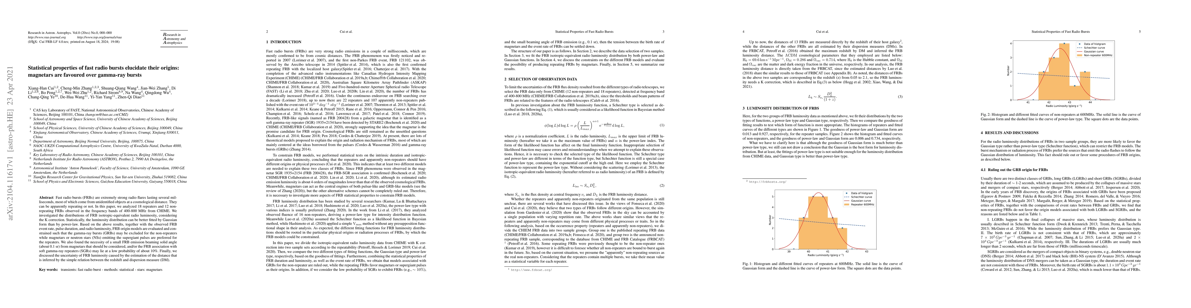 This paper analyzes the statistical properties of fast radio bursts (FRBs) observed by CHIME, finding that their luminosity distribution fits better with Gaussian than power-law. It concludes that magnetars are more likely origins for repeaters than gamma-ray bursts, while non-repeaters may be excluded from GRBs.