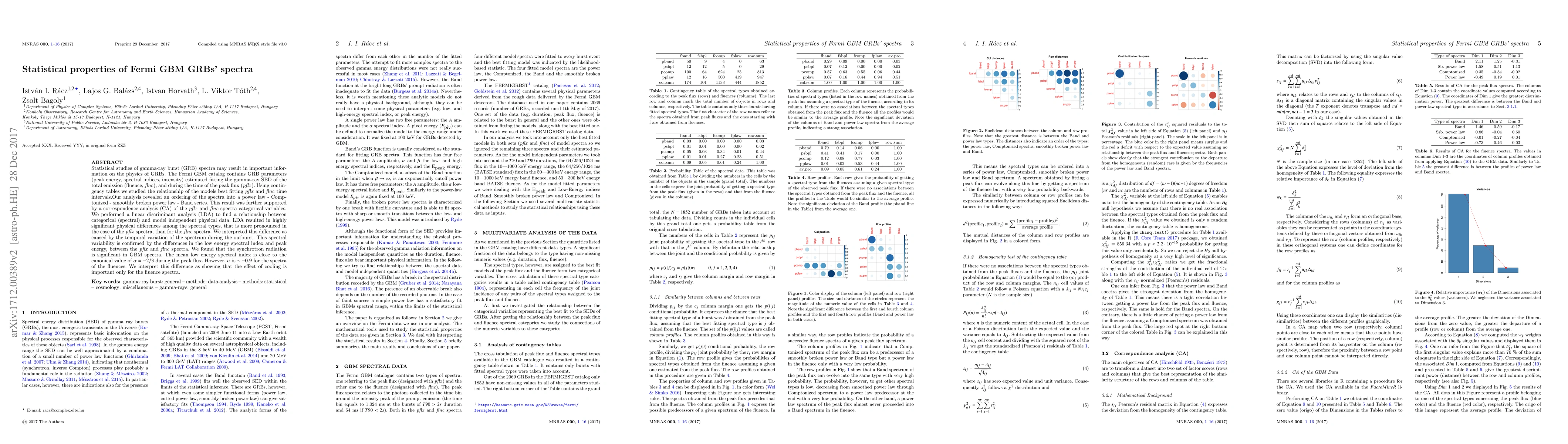 Statistical studies of gamma-ray burst (GRB) spectra may result in important information on the physics of GRBs. The Fermi GBM catalog contains GRB parameters (peak energy, spectral indices, intensity) estimated fitting the gamma-ray SED of the total emission (fluence, flnc), and during the time of the peak flux pflx. Using contingency tables we studied the relationship of the models best fitting pflx and flnc time intervals. Our analysis revealed an ordering of the spectra into a power law - Comptonized - smoothly broken power law - Band series. This result was further supported by a correspondence analysis (CA) of the pflx and flnc spectra categorical variables. We performed a linear discriminant analysis (LDA) to find a relationship between categorical (spectral) and model independent physical data. LDA resulted in highly significant physical differences among the spectral types, that is more pronounced in the case of the pflx spectra, than for the flnc spectra. We interpreted this difference as caused by the temporal variation of the spectrum during the outburst. This spectral variability is confirmed by the differences in the low energy spectral index and peak energy, between the pflx and flnc spectra. We found that the synchrotron radiation is significant in GBM spectra. The mean low energy spectral index is close to the canonical value of {\alpha} = -2/3 during the peak flux. However, $\alpha$ is ~ -0.9 for the spectra of the fluences. We interpret this difference as showing that the effect of cooling is important only for the fluence spectra.