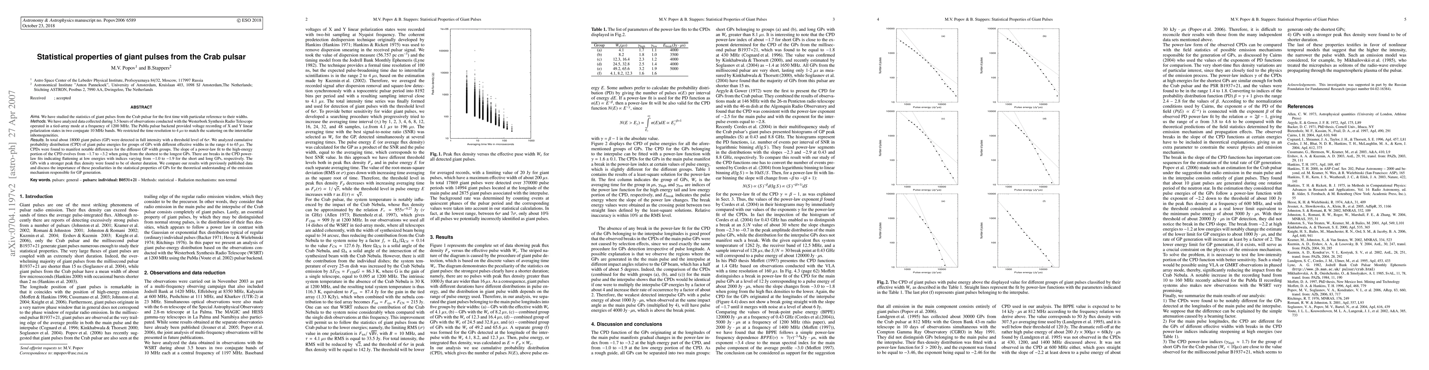 Researchers analyzed 18,000 giant pulses from the Crab pulsar, finding that their widths and energies follow different statistical patterns, with shorter pulses having stronger peak flux densities.
